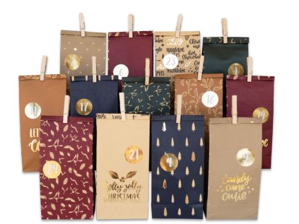 V sadě najdete 24 potištěných papírových sáčků, 24 zlatých samolepek s čísly a 24 dřevěných kolíčků, díky nimž si snadno vytvoříte vlastní kalendář podle fantazie. Každý sáček má rozměr 14 x 22 cm a je opatřen pevným dnem, takže může stát samostatně, nebo ho můžete zavěsit na provázek. Vznikne tak půvabná dekorace, která zútulní váš domov po celé adventní období.