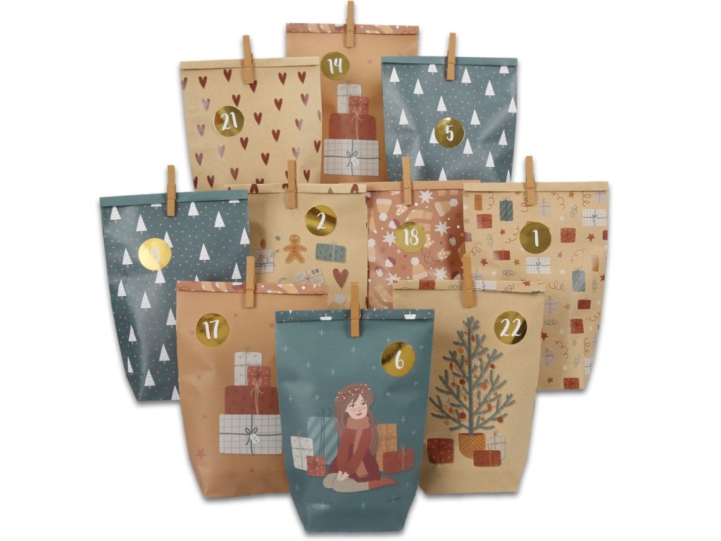 V sadě najdete 24 potištěných papírových sáčků, 24 zlatých samolepek s čísly a 24 dřevěných kolíčků, díky nimž si snadno vytvoříte vlastní kalendář podle fantazie. Každý sáček má rozměr 14 x 22 cm a je opatřen pevným dnem, takže může stát samostatně, nebo ho můžete zavěsit na provázek. Vznikne tak půvabná dekorace, která zútulní váš domov po celé adventní období.