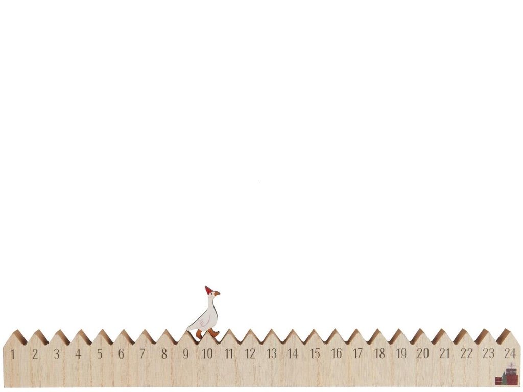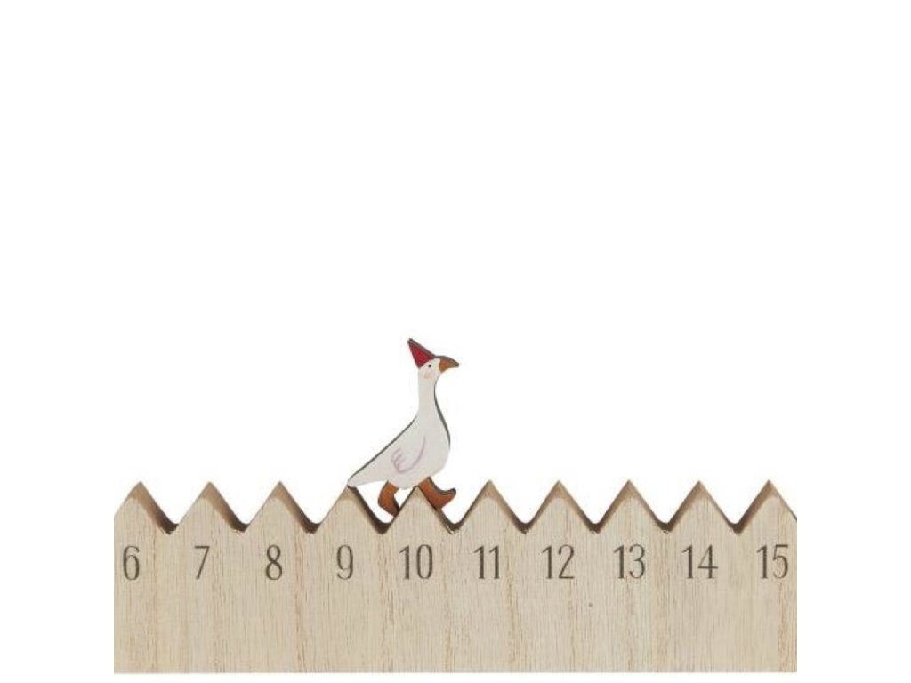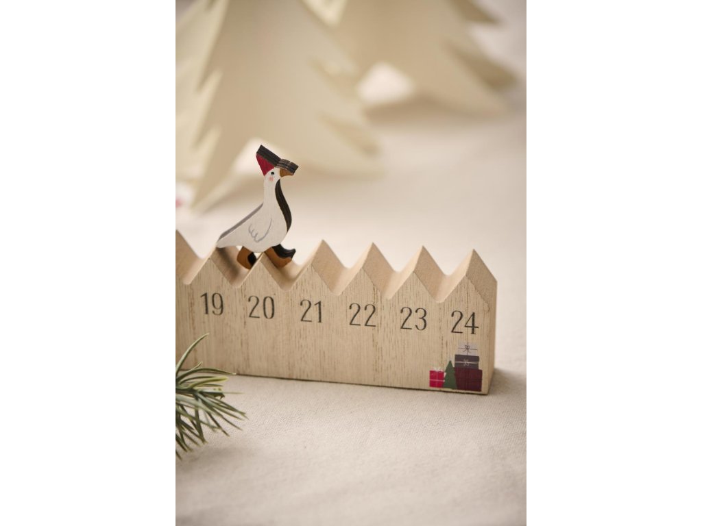 Kalendář je vyroben ze dřeva a díky svému prodlouženému tvaru působí jako malá zimní krajina. Pod jednotlivými dřevěnými stříškami se ukrývají dny od 1. do 24. prosince, které můžete společně s dětmi odpočítávat – den po dni – pomocí husičky v červené čepici, která se posouvá až do chvíle, kdy nadejde Štědrý den.