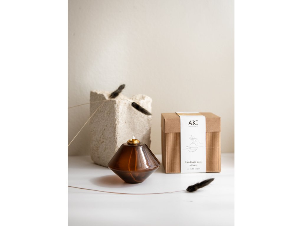 Aki Oil Lamp je projekt malé nezávislé italské značky zaměřující se na výrobu olejových lamp a difuzérů, které jsou ústně foukané z kvalitního českého skla. Aki Oil Lamp spojují krásu, funkčnost a dokonalý relaxační prožitek. Jejich design a použité materiály obstojí napříč trendům po dlouhé roky. Díky svému klasickému petrolejovému mechanismu vytváří lampa jemné a přirozené světlo, které je ideální pro vytvoření útulné hygge atmosféry. Plamen petrolejové lampy je teplejší a měkčí než běžné elektrické osvětlení, což ji činí ideální pro večerní nebo slavnostní osvětlení v interiéru i jako venkovní dekorace. Jsou vyráběny kombinací dvou vrstev skla, nejprve opálu a poté barevného skla, které dodávají lampě jedinečné odstíny.