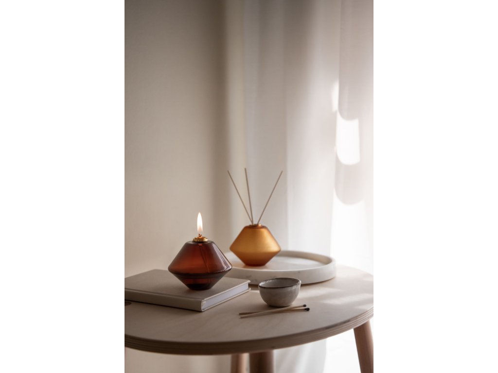 AKI olejové lampy se nyní nově dají využít jako vonný difuzér nebo váza pro živé květy. Postačí odšroubovat mosazné víčko na knot, na lampě pak zůstane pouze ozdobné zlaté kolečko, do kterého můžete vložit dřevěné tyčinky a přidat oblíbenou vůni, popřípadě jen čerstvou vodu a natrhané květy.