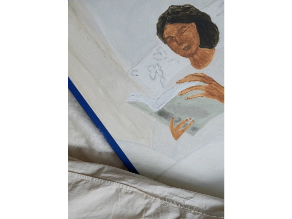 Světlé tóny béžové, krémové a jemně šedé barvy dodávají dílu lehce snovou, téměř meditativní atmosféru, která navozuje pocit tepla a klidu. Autorka mistrně zachycuje ženskou postavu ponořenou do čtení a vytváří obraz, jenž působí vyrovnaně, poeticky a dokonale harmonicky.