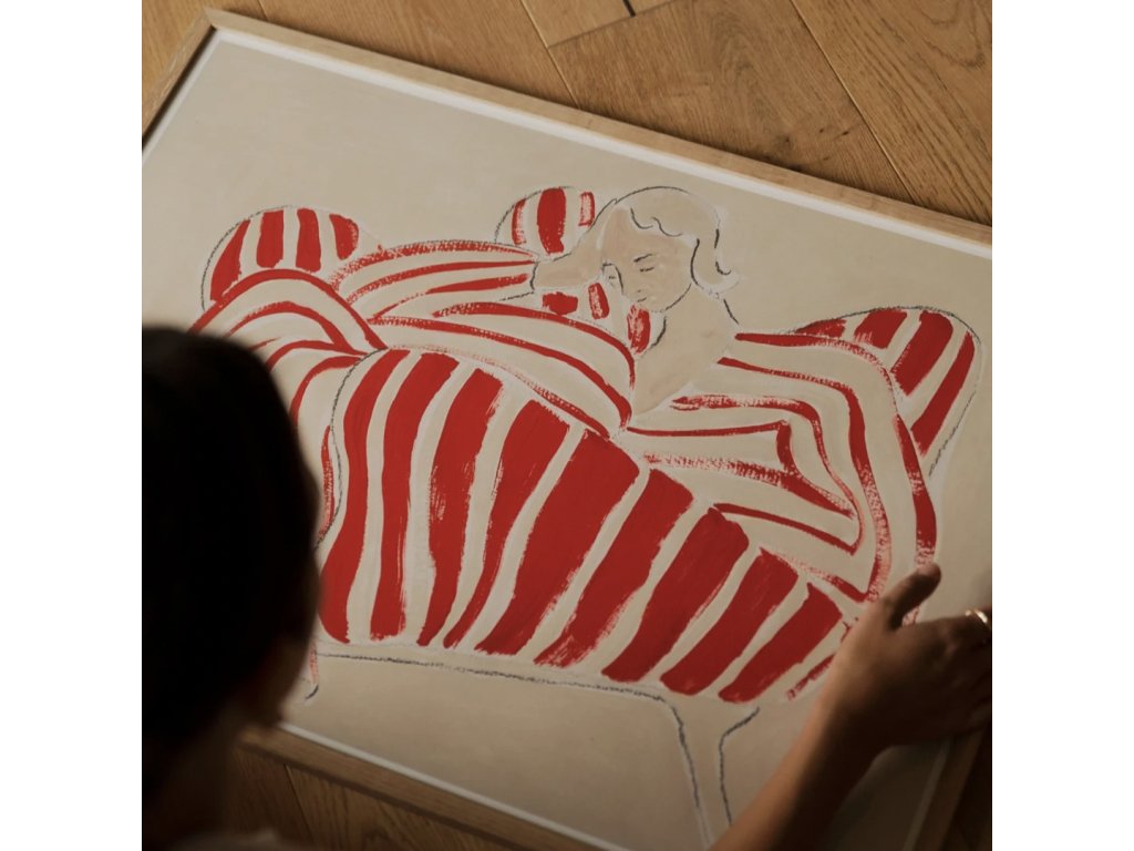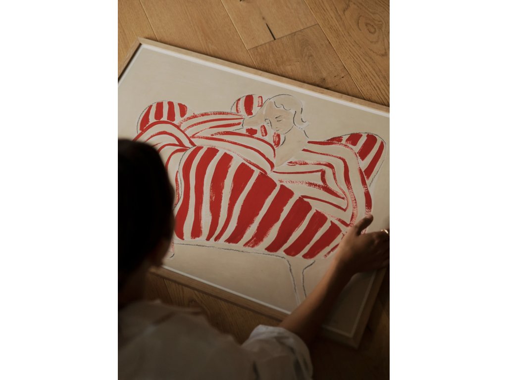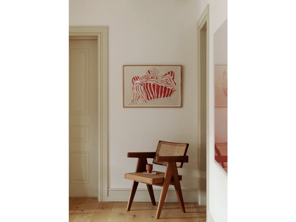 Autorský plakát Red Chair od švédské umělkyně Sofie Lind zachycuje chvíli naprostého uvolnění. Okamžik, kdy se svět na chvíli zastaví. Žena, klidně se opírající v červenobílém pruhovaném křesle, jako by se právě ztratila v myšlenkách. Jemné tahy štětce, lehce skloněná hlava a kontrast červené s tlumeným béžovým pozadím vytvářejí obraz, který působí současně energicky i ztišeně.