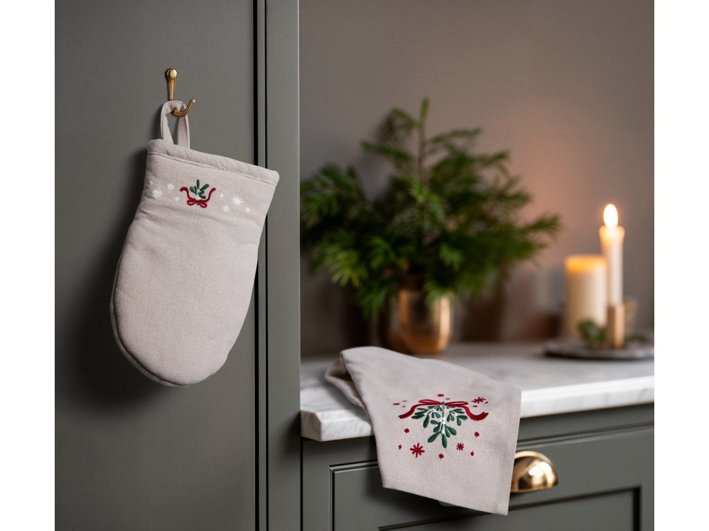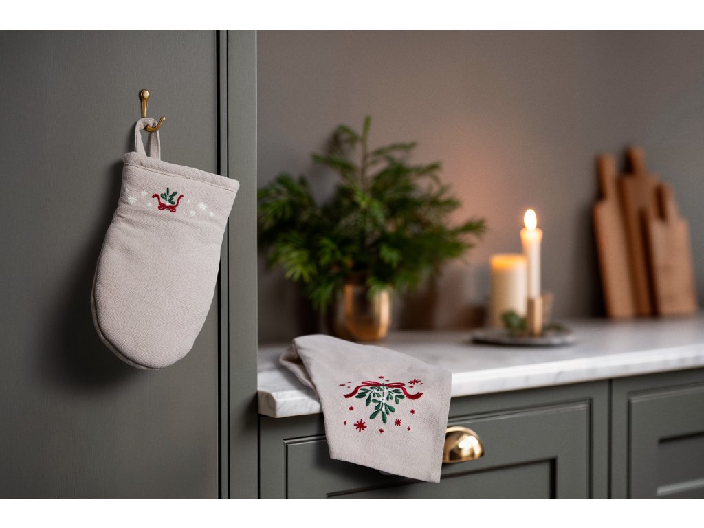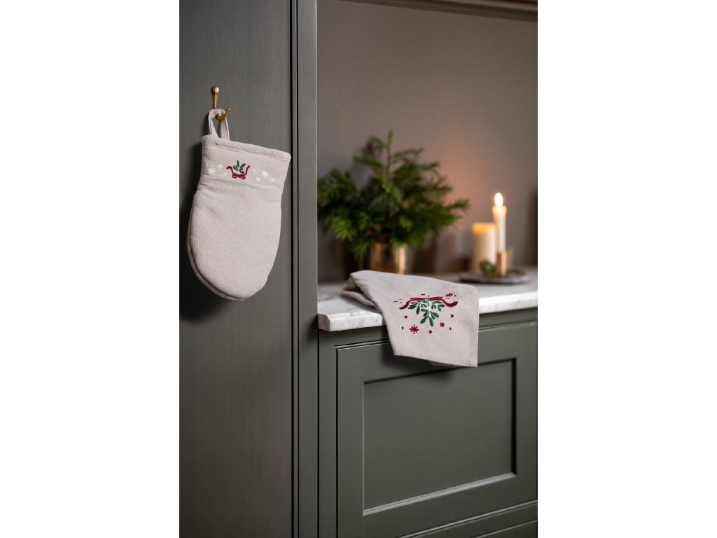 Utěrka je vyrobena z měkké směsi recyklované bavlny a polyesteru s certifikací GRS, takže je nejen šetrná k přírodě, ale i vysoce odolná a příjemná na dotek. Na pískovém odstínu ji zdobí výšivka jmelí svázaného červenou mašlí, doplněná decentními hvězdičkami, které jako by tiše zářily zimní oblohou.