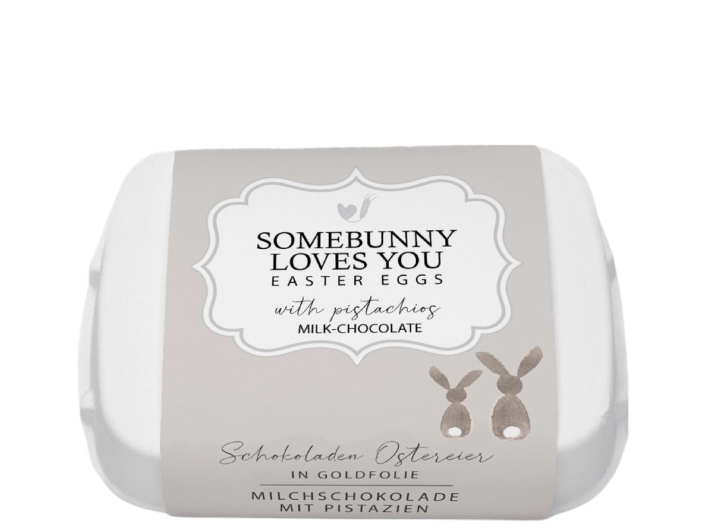 Balení je řešené jako malé papírové plato na vajíčka, doplněné o dekorativní přebal s motivem zajíčků a nápisem Somebunny Loves You. Krabička se tak hodí nejen jako sladkost, ale i jako drobný dárek vhodný jako poděkování pro hostitele nebo sladká pozornost pro koledníky. Potěší každého, kdo má rád mléčnou čokoládu s jemnou náplní a ocení pečlivě zpracované balení.