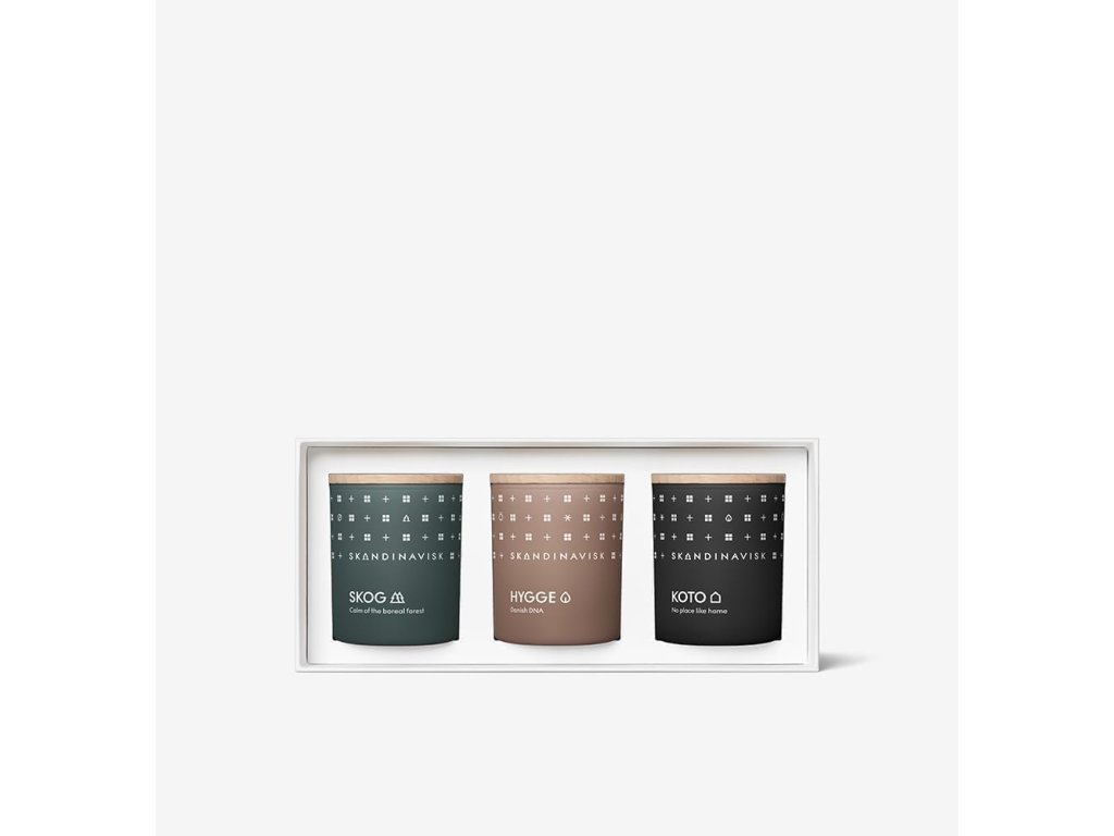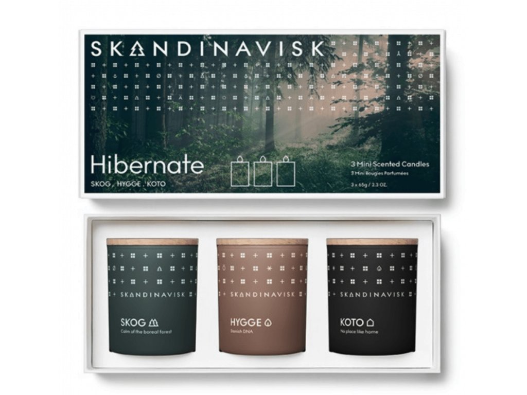 Dárková sada mini svíček HIBERNATE potěší každého milovníka úžasných vůní SKANDINAVISK. Set obsahuje tři svíčky Skog, Hygge a Koto. Skleněný obal svíčky je vyrobený z recyklovaných materiálů, naplněný je řepkovým voskem s knotem ze 100% bavlny. Součástí svíčky je také víčko z bukového dřeva s logem značky. Každou přírodní svíčku nechte pořádně na poprvé rozhořet, aby se vosk roztavil až k okrajům skleněného svícnu, až poté ji zhasněte. Zabráníte tím tak vzniku tunelu, kdy svíčka zhasíná. Svíčka by neměla hořet déle než 3 hodiny v kuse.