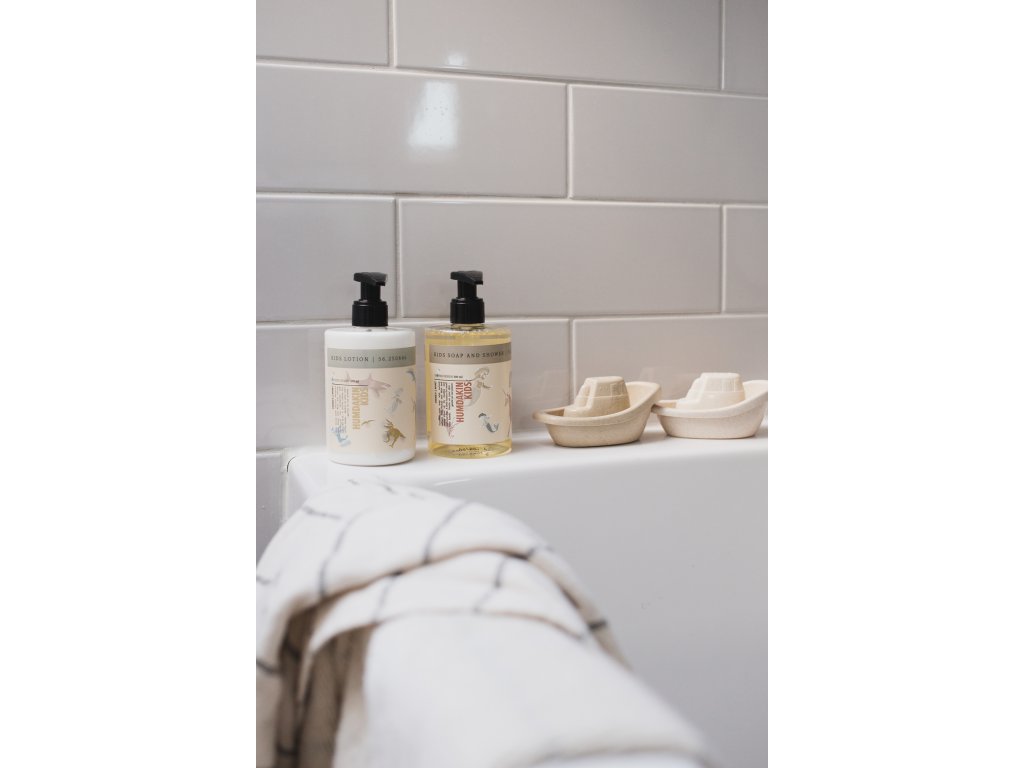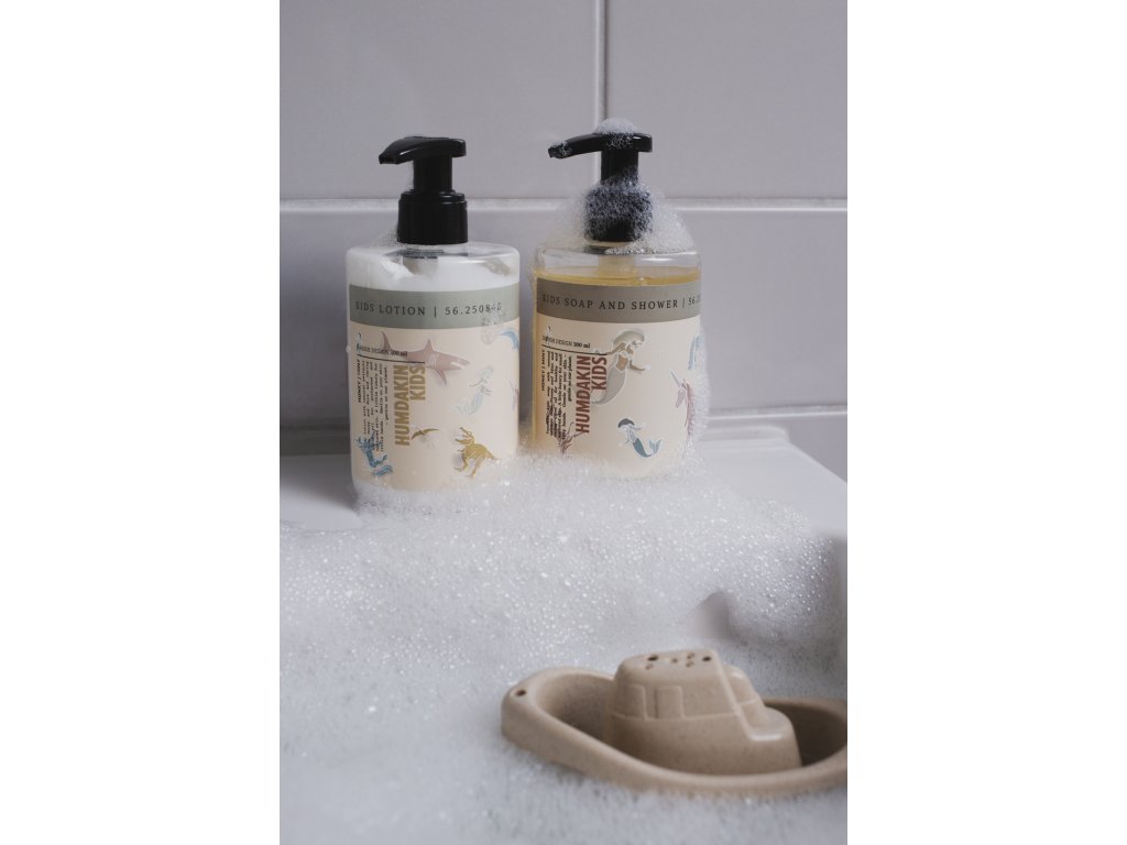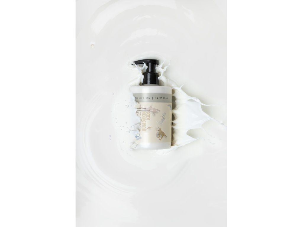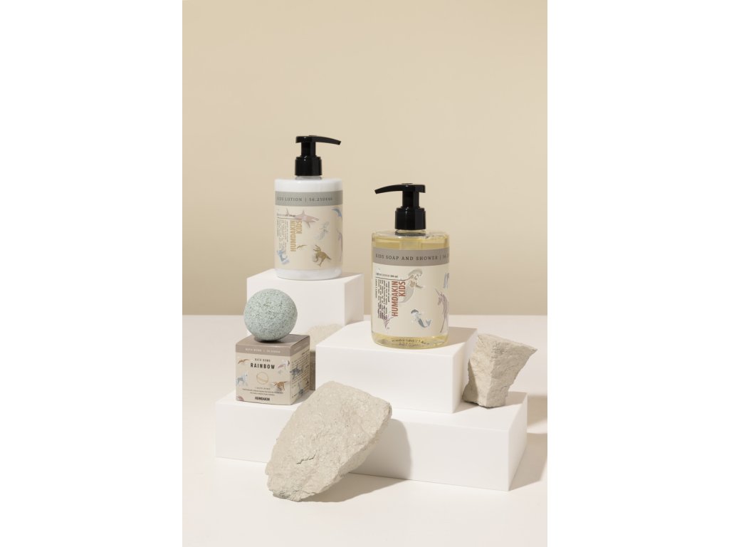 Produkty dánské značky HUMDAKIN neobsahují žádná barviva, parabeny ani chemické látky. Tělové mléko je dodáváno v plastové lahvičce s pumpičkou s pohádkovým designem jednorožců a dinosaurů. Díky stylovému balení bude mléko krásným doplňkem koupelny.