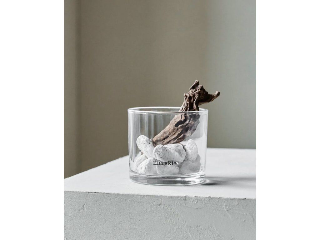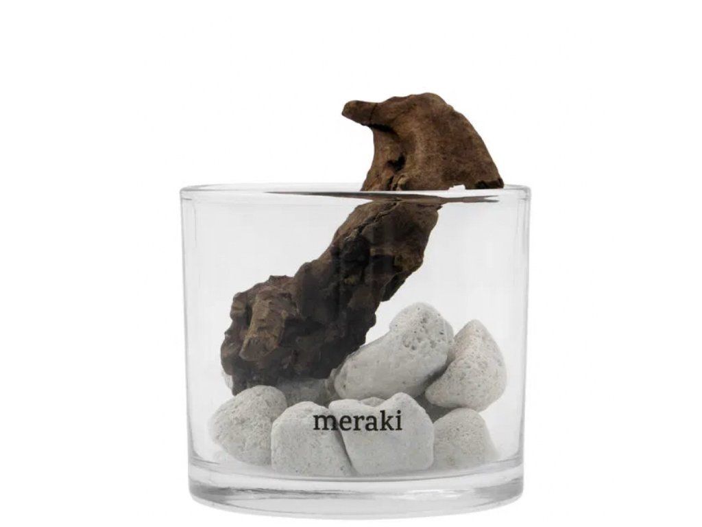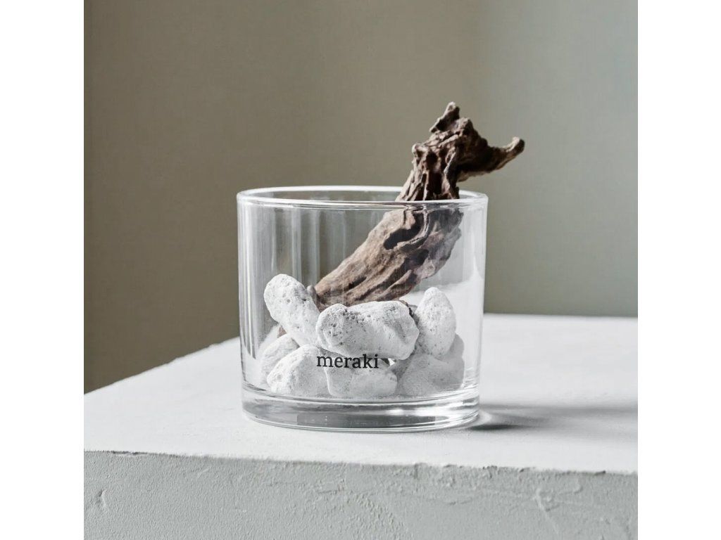 Vonný difuzér Lavastone & Wood od dánské značky Meraki tvoří skleněný kalíšek z čirého skla, který zdobí logo značky v černém provedení. Uvnitř najdete porézní lávové kameny a kousek tmavého naplaveného dřeva s nepravidelným tvarem a výraznou strukturou.