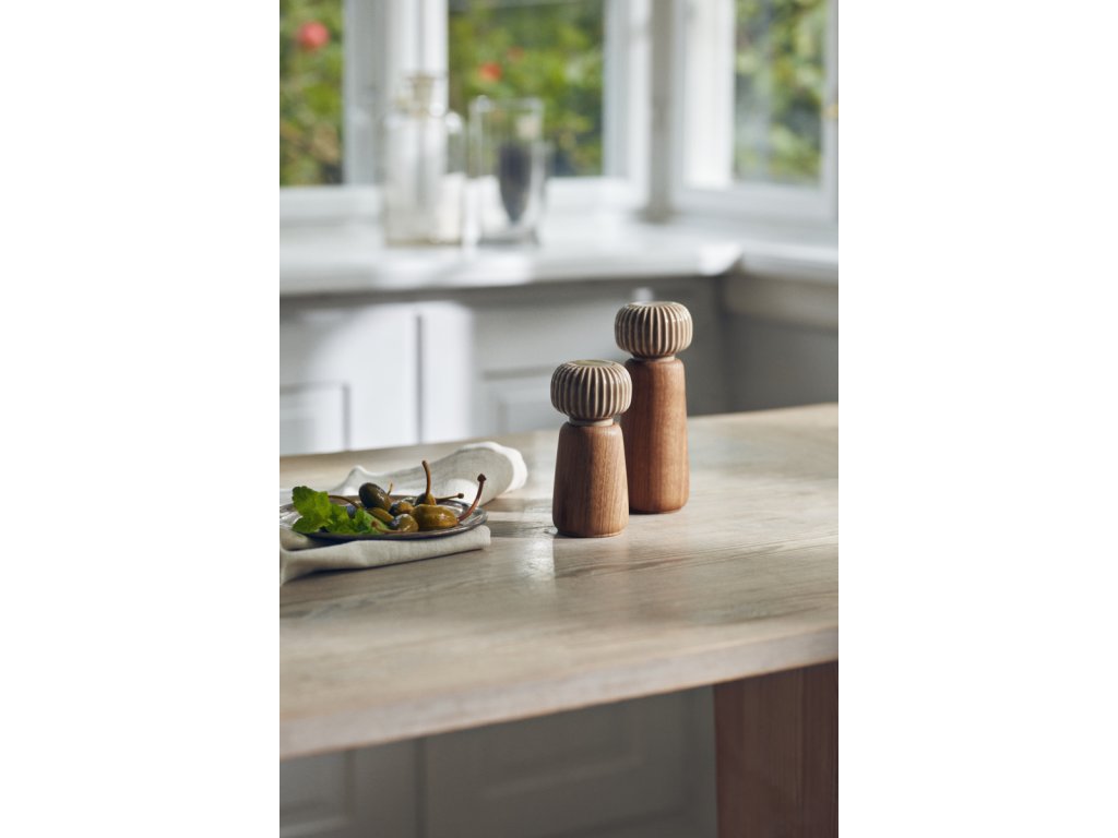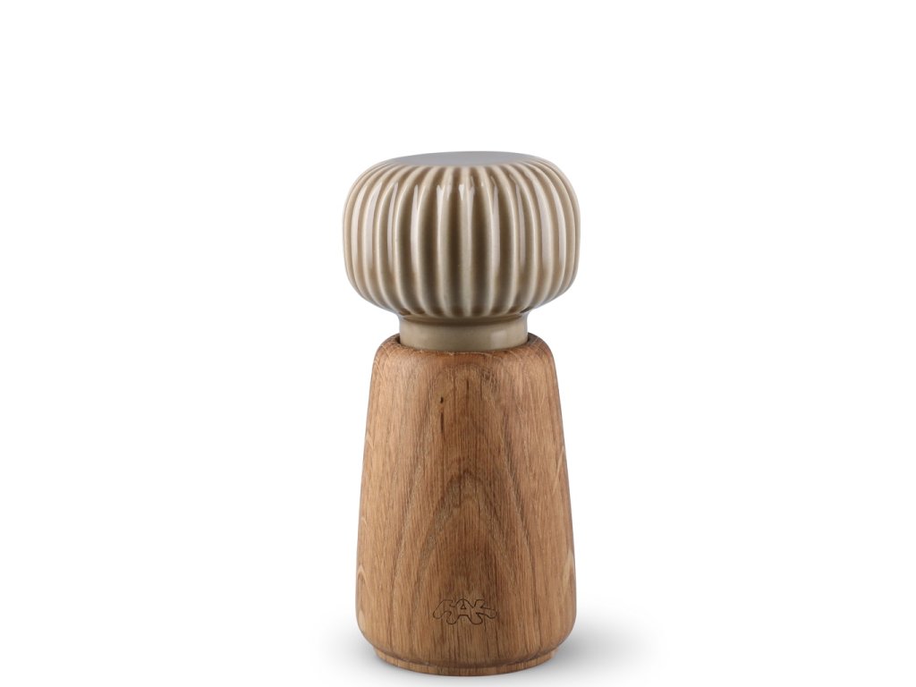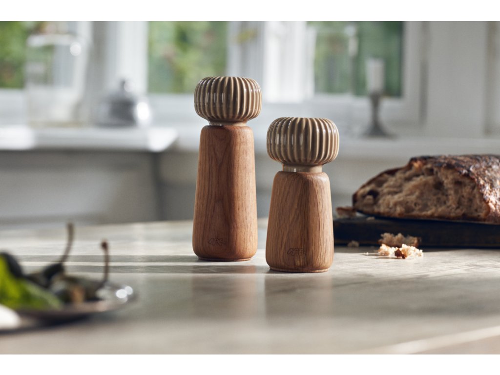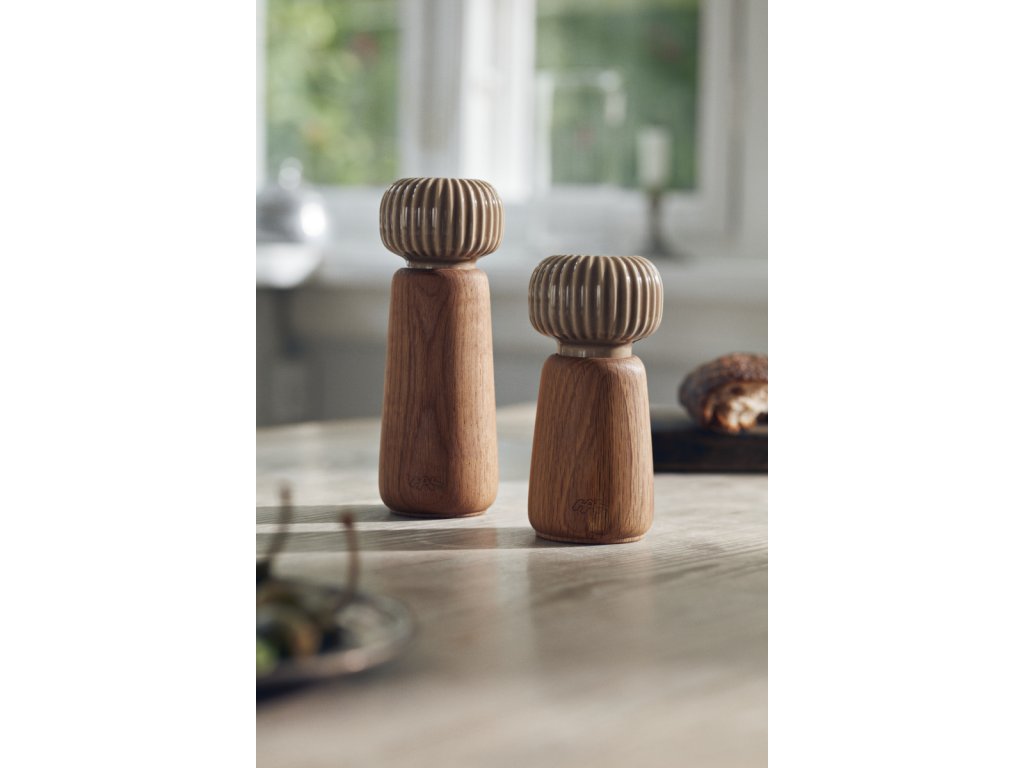 Tělo mlýnku je vyrobené z dubového dřeva s přirozenou kresbou, zatímco horní část tvoří keramická hlavice v hnědém glazování. Typické svislé rýhování, které je pro kolekci Hammershøi charakteristické, navrhl norský designér Hans-Christian Bauer. Díky němu se mlýnek nejen dobře drží, ale zároveň získává osobitý vzhled, který se snadno sladí s další keramikou ze stejné kolekce.