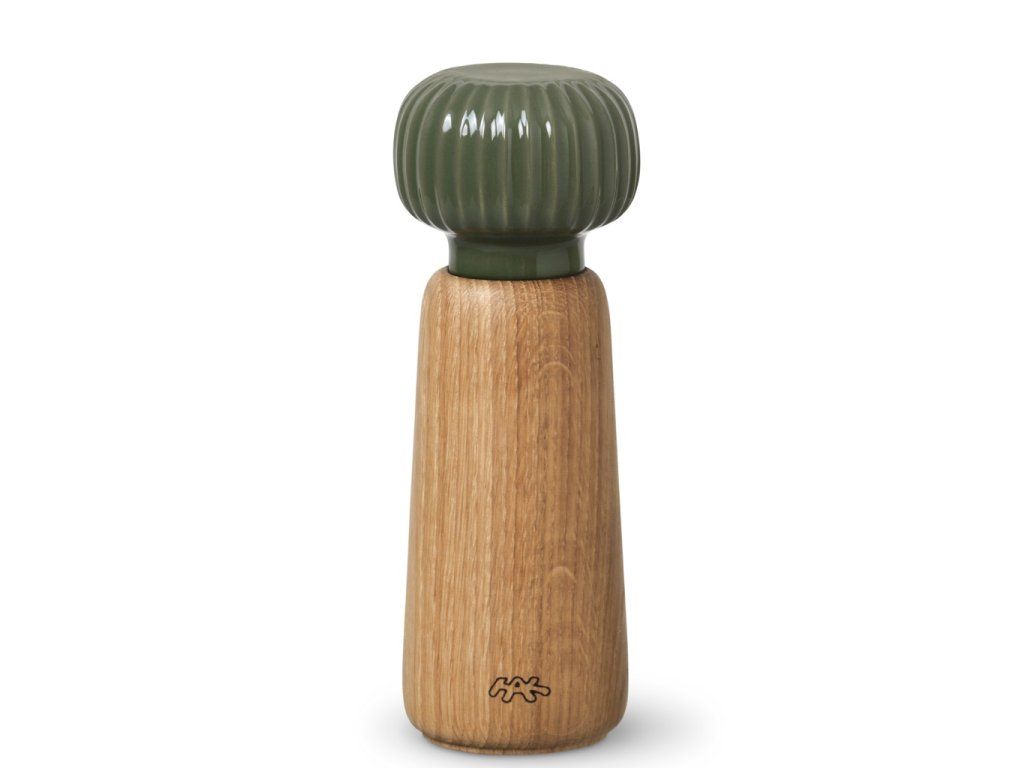 Tělo mlýnku je vyrobené z dubového dřeva s přirozenou kresbou, zatímco horní část tvoří keramická hlavice v tmavě zeleném glazování. Typické svislé rýhování, které je pro kolekci Hammershøi charakteristické, navrhl norský designér Hans-Christian Bauer. Díky němu se mlýnek nejen dobře drží, ale zároveň získává osobitý vzhled, který se snadno sladí s další keramikou ze stejné kolekce.