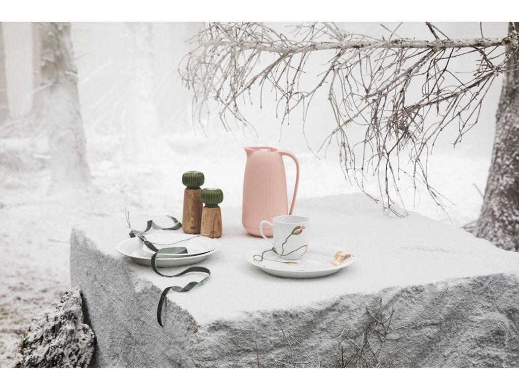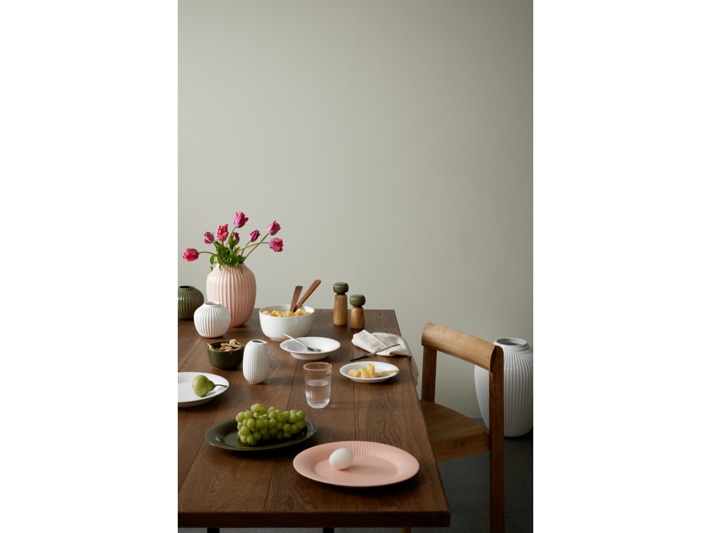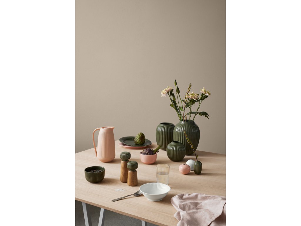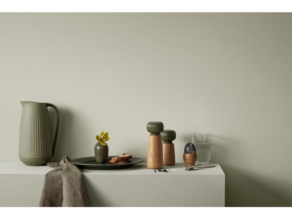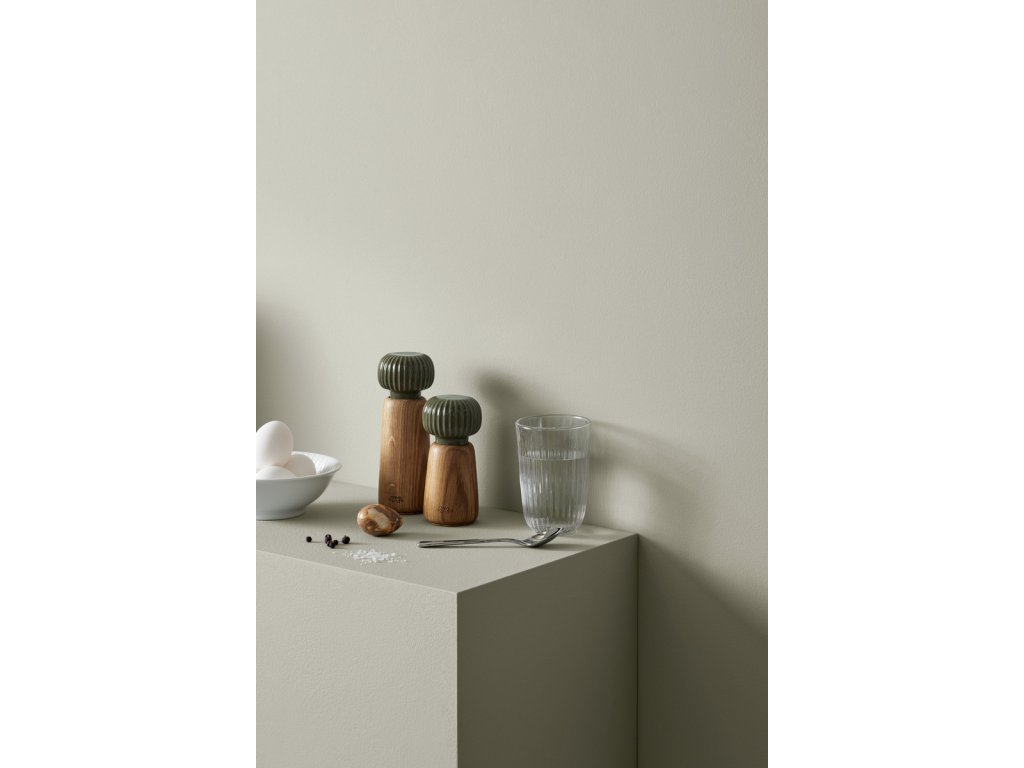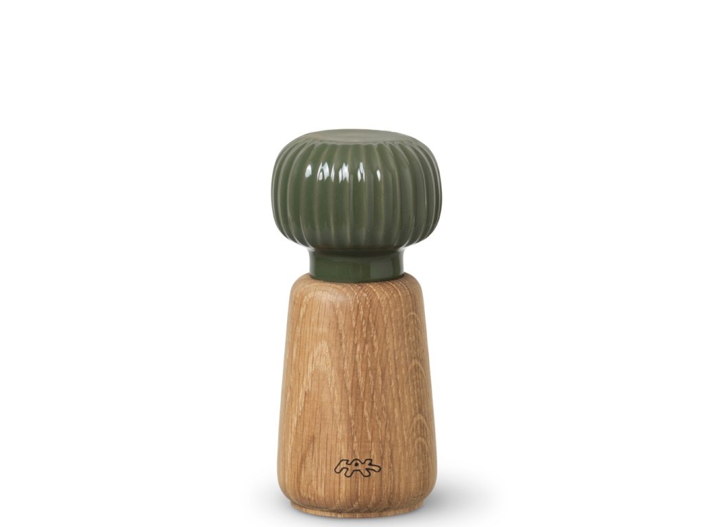 Tělo mlýnku je vyrobené z dubového dřeva s přirozenou kresbou, zatímco horní část tvoří keramická hlavice v tmavě zeleném glazování. Typické svislé rýhování, které je pro kolekci Hammershøi charakteristické, navrhl norský designér Hans-Christian Bauer. Díky němu se mlýnek nejen dobře drží, ale zároveň získává osobitý vzhled, který se snadno sladí s další keramikou ze stejné kolekce.