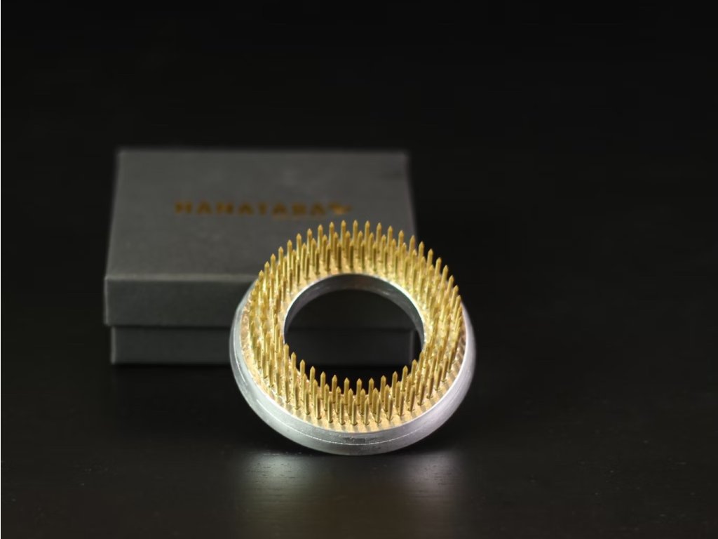 HANATABA Kenzan je světově unikátní floristická pomůcka ze Švédska pro vytváření dechberoucích kytic s výjimečným výrazem. Hanataba Kenzan The Ring je jedinečný kovový prstenec s měděnými hroty, který velmi jednoduše umožňuje vytvářet krásné a vzdušné květinové vazby. Staňte se profesionálními floristy a vytvořte si z pohodlí domova minimalistické aranžmá, které zdůrazní linie a celý vizuální proces květinové vazby. Dodává se v matně černé papírové krabičce. Kenzan The Ring jistě potěší každého milovníka květin a bude i luxusním dárkem pro floristické a kreativní nadšence.