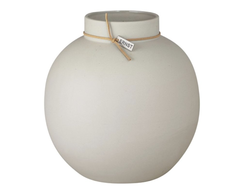Kameninová váza od švédské značky ERNST vnese do vašeho domova rustikální nádech. Tomuto nádhernému kousku, který má kolem hrdla stylovou koženou šňůrku s kovovým plíškem s nápisem ERNST, bude slušet čerstvě utržené luční kvítí, obilné klasy i suché větvičky. Váza ale bude také pěknou dekorací i sama o sobě.