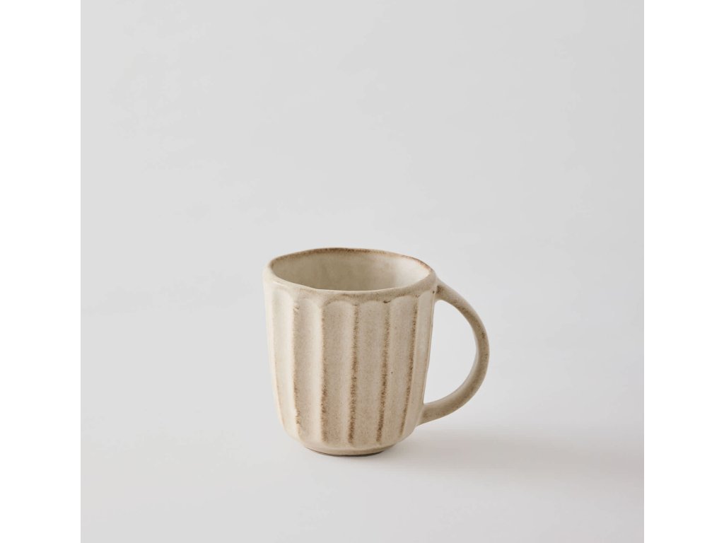 Kameninový hrnek od švédské značky Tell Me More patří do série Elba, která se vyznačuje organickým vzhledem a proměnlivou kresbou povrchu. Hrnek má objem přibližně 300 ml, jeho tvar je kónický a zdobí ho svislé vroubkování, které vytváří plastickou strukturu po celém obvodu. Pískově béžový odstín připomíná vyschlou zeminu prohřátou sluncem. Hrnečku nechybí ouško, které má dostatečnou velikost pro lehký a pohodlný úchop.