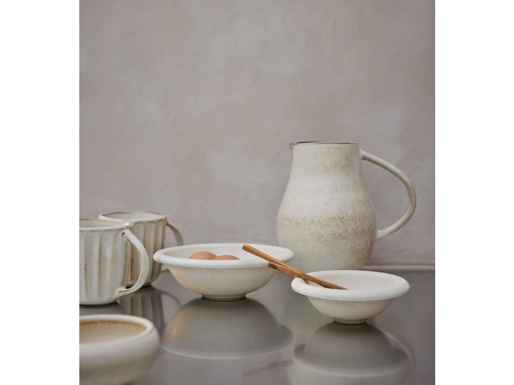 Hrnek se hodí na ranní kávu i na odpolední čaj na pohovce v klidu domova. Vynikne vedle kameninové misky nebo džbánu ze stejné série, kde se jednotlivé tóny přirozeně propojí. Dobře ladí i s dřevěným podnosem a lněným ubrusem, kde jeho struktura ještě víc vystoupí.