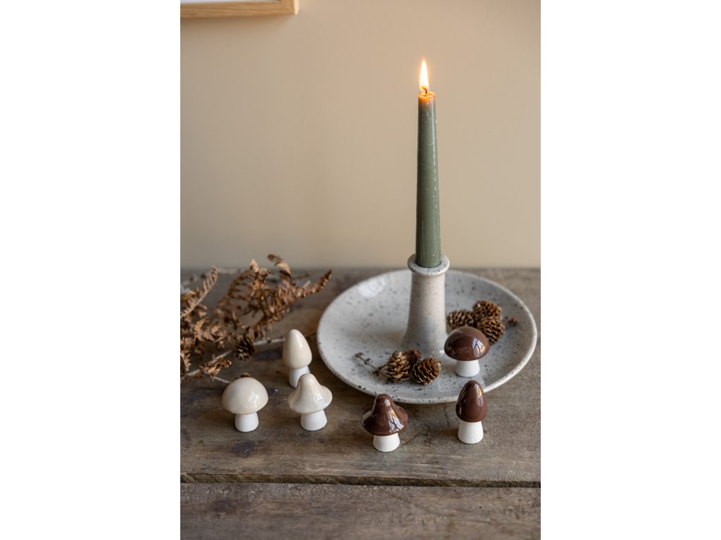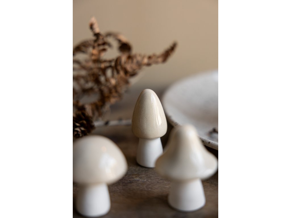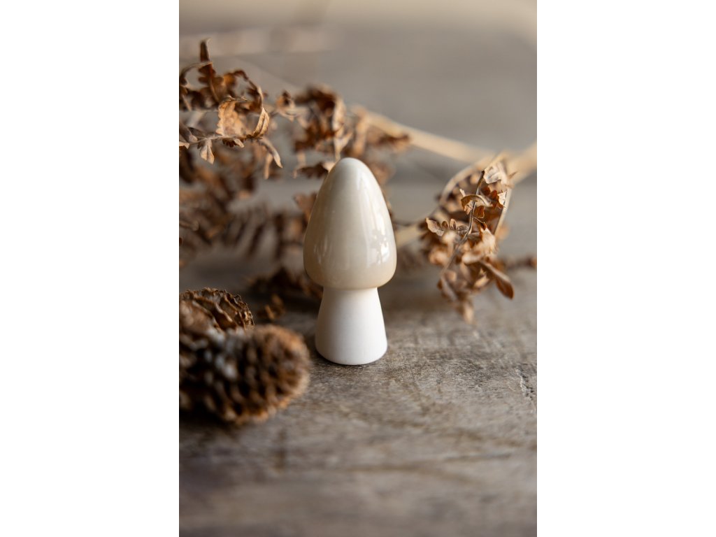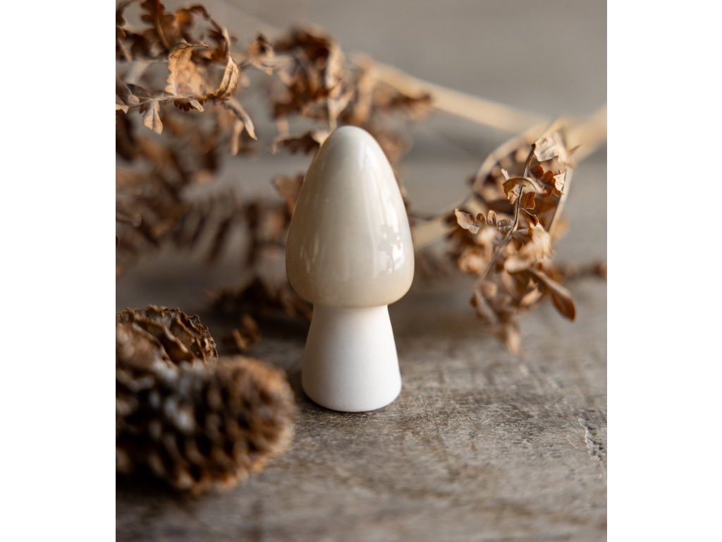 Keramická houbička Bohult od švédské značky Storefactory Scandinavia působí jemně a přirozeně, jako by si z lesa přinesla kousek podzimní atmosféry přímo k vám domů. Její hladká béžově glazovaná hlavička se elegantně leskne a kontrastuje s matnou bílou nožičkou, což z ní dělá drobný, ale výrazný detail, který zaujme na první pohled.