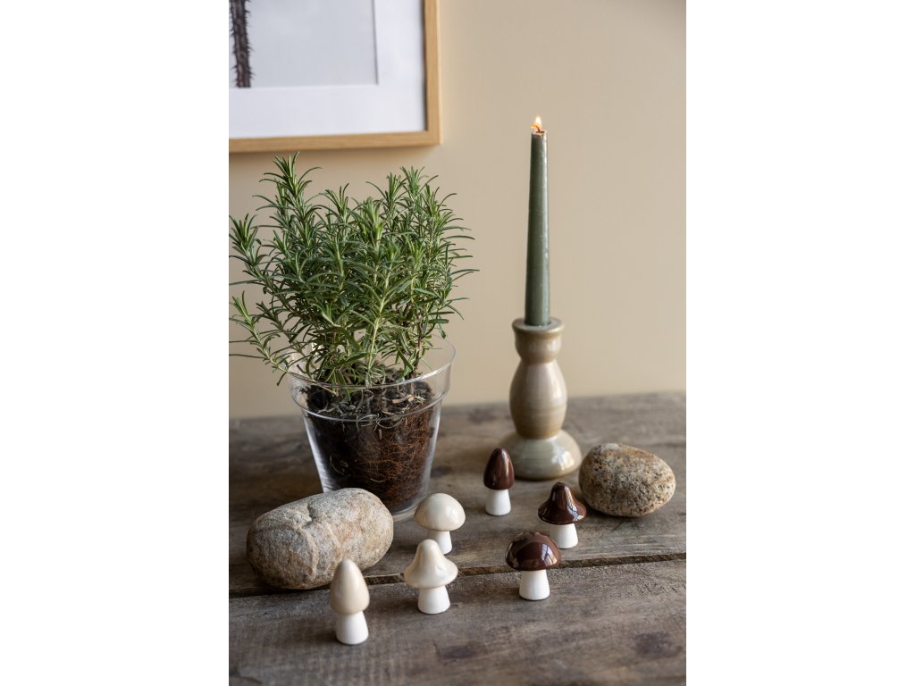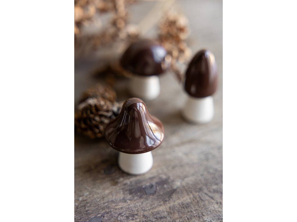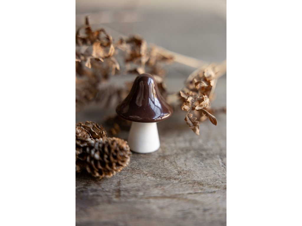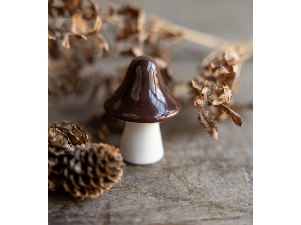Keramická houbička Bosten od švédské značky Storefactory Scandinavia působí jemně a přirozeně, jako by si z lesa přinesla kousek podzimní atmosféry přímo k vám domů. Její hnědě glazovaná hlavička se elegantně leskne a kontrastuje s matnou bílou nožičkou, což z ní dělá drobný, ale výrazný detail, který zaujme na první pohled.