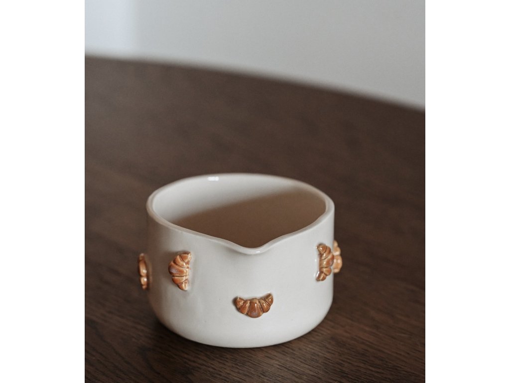 Keramická miska na přípravu matchi zaujme na první pohled plastickými croissanty, které vystupují z hladkého povrchu. Připomínají nám pomalá rána a každodenní milé rituály. Krémový odstín glazury působí přirozeně a v kombinaci s hravým dekorem vytváří vyvážený kontrast. Miska krásně zapadne do kuchyně, kde má své místo mezi oblíbenými kousky, jež se používají každý den.