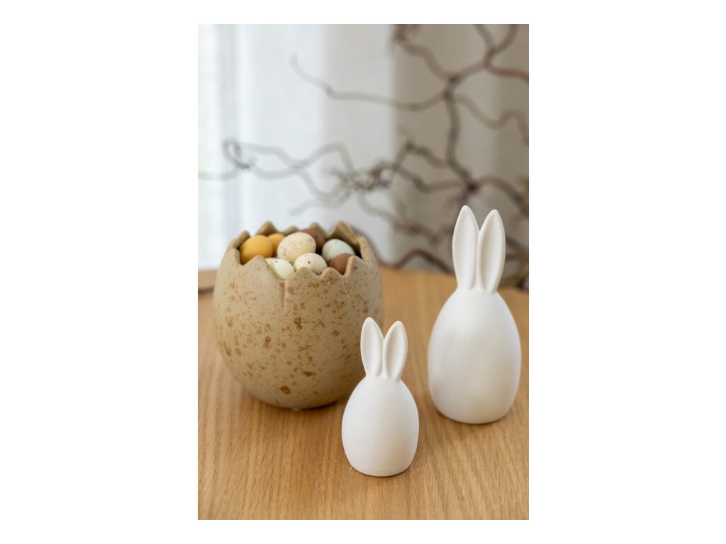 Dodejte svému domovu kouzlo skandinávské jednoduchosti s touto jedinečnou velikonoční dekorací od Storefactory Scandinavia. Neglazovaná keramika v podobě vajíčka se zaječími oušky působí jemně, elegantně a přirozeně zapadne do každého interiéru. Tento ušák se skvěle hodí na sváteční stůl, poličku, komodu nebo okenní parapet. Doplňte ho o další keramické figurky, minimalistický svícen nebo dekorační misku ve tvaru rozbité skořápky. Pro dosažení dokonalého efektu přidejte drobná vajíčka či velikonoční osení.