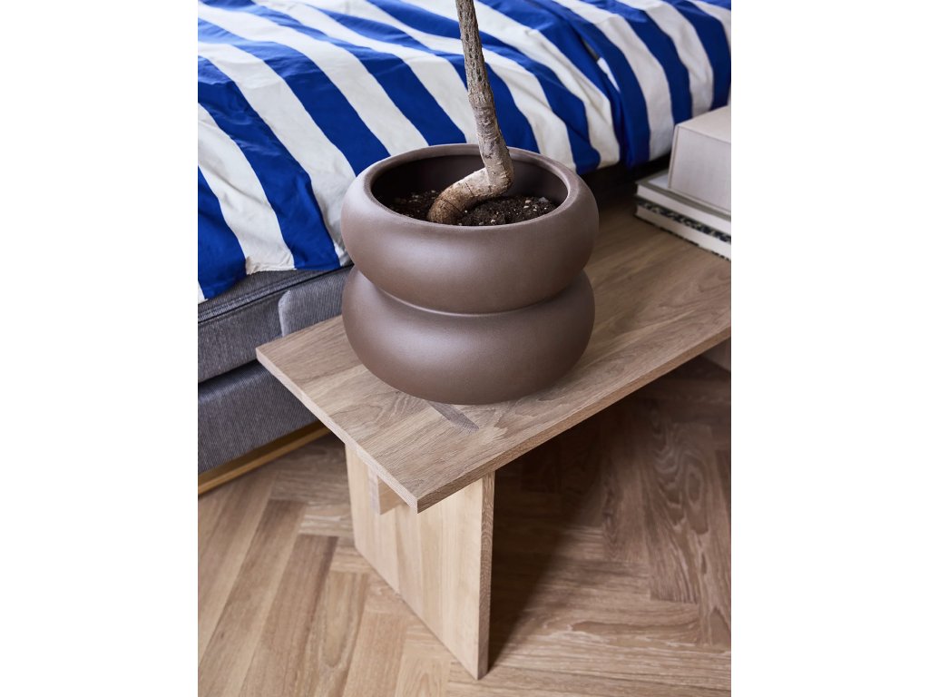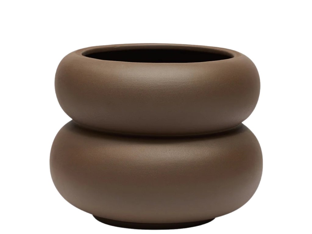 Kameninový květináč Kupla od OYOY má výrazný tvar tvořený dvěma zaoblenými částmi, které na sebe přímo navazují. Působí stabilně a vyváženě, takže dobře funguje jako samostatný prvek. Matný povrch v hnědém odstínu je nenápadný a snadno se kombinuje se zemitými tóny i přírodními materiály.