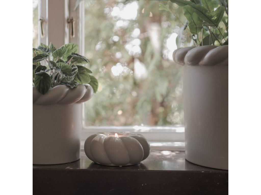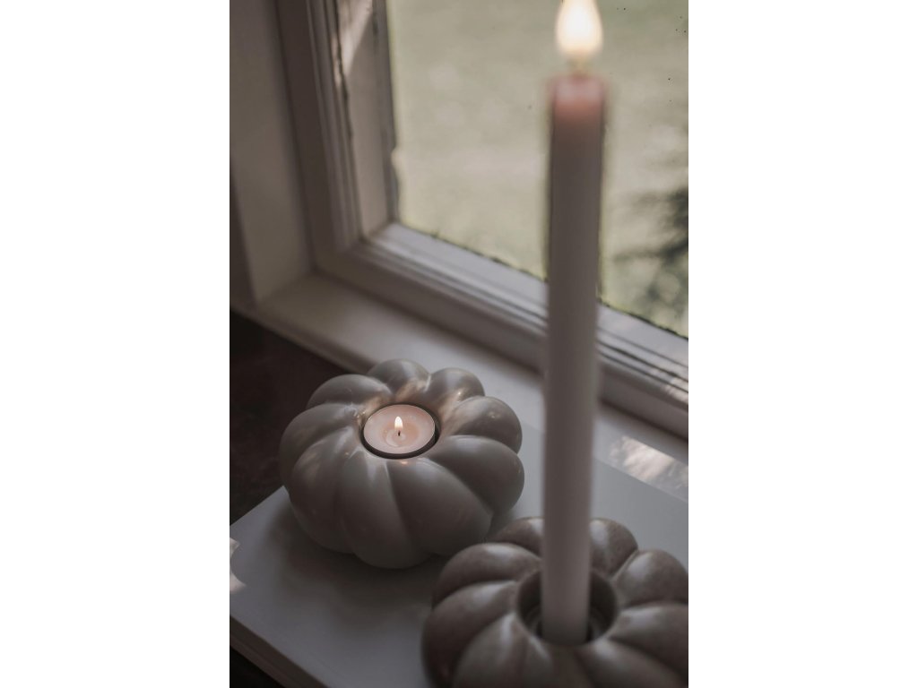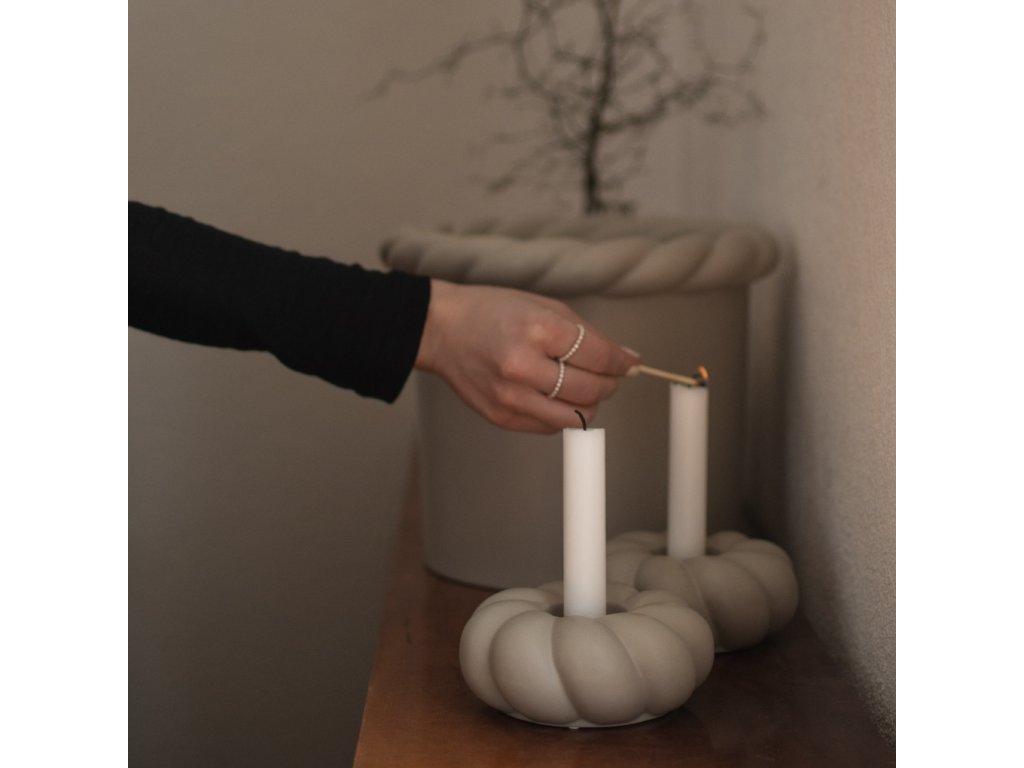 Svícen je vyrobený z kvalitní keramiky s matnou glazurou, díky níž vynikne jeho struktura i jemné barevné nuance. Praktickým prvkem je integrovaný kalíšek uvnitř, který umožňuje používat jak čajové svíčky, tak i klasické vysoké svíčky o průměru 2,2 cm. Díky tomu můžete svícnu snadno měnit výraz. Jednou vytvoří intimní teplé světlo s tea lightem, podruhé se stává elegantní dekorací s vysokou svíčkou.
