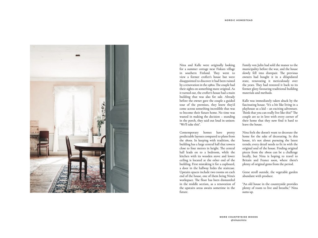 Obklopeni rozkvetlými jabloněmi a šuměním vysoké trávy, přicházíte ke starému venkovskému domu. Pod nohama křupe štěrk, lišejníky porostlé kamenné schody zvou k výstupu a červené dveře se otevírají do světa, kde se čas zpomalí. Kniha Nordic Homestead vás zavede do deseti autentických domovů na finském venkově, kde se historie setkává s přírodou a každodennost se mění v poetický zážitek.