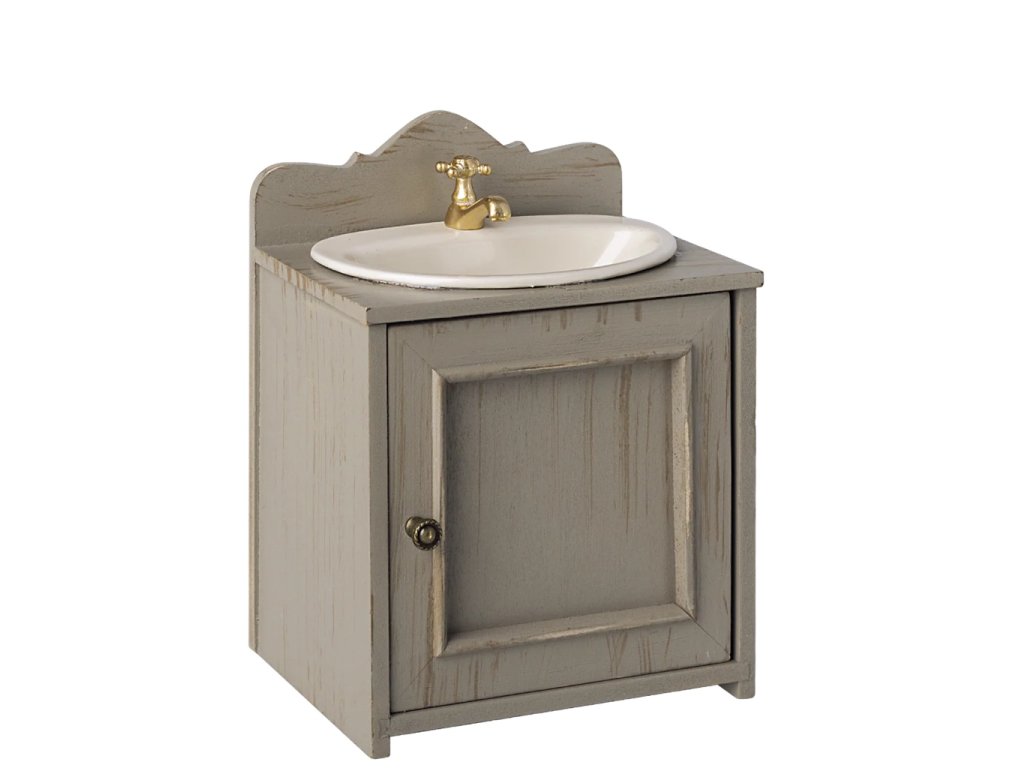 Každá pořádná myší koupelna si zaslouží vlastní umyvadlo a tato stylová dřevěná skříňka se vsazeným porcelánovým umyvadlem a zlatou baterií je jako vytažená z pohádkové chaloupky. Její jemně patinovaný vzhled v šedavém tónu dodává nádech vintage kouzla a působí, jako by měla svůj vlastní příběh.