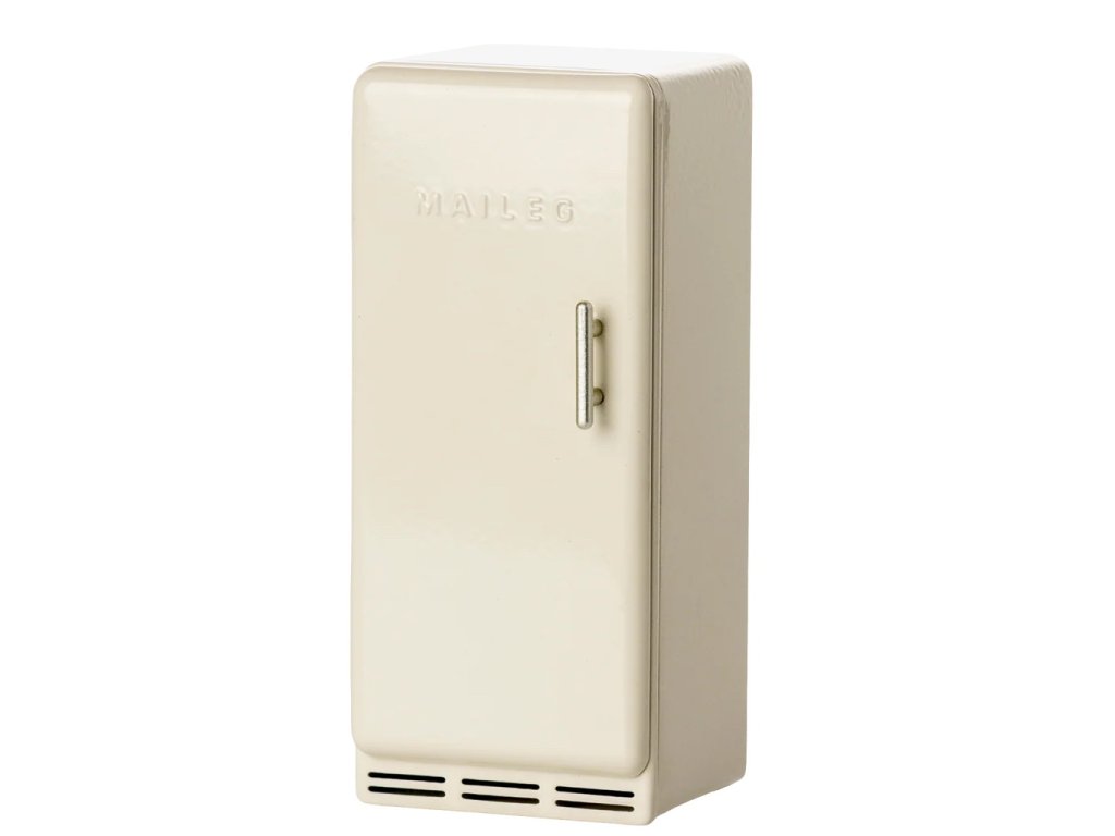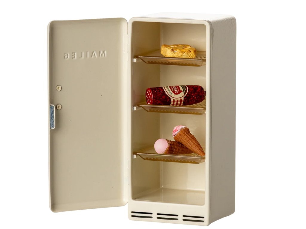 V kuchyňce myšek Maileg se stále něco děje a právě tady stojí jejich kovová lednička v krémovém odstínu, která se stala srdcem celého domečku. Na první pohled zaujme svým retro designem, pečlivým zpracováním a autentickým kovovým povrchem, který působí jako zmenšenina skutečné lednice. Uvnitř se ukrývají tři poličky, kam si myšky ukládají všechny své oblíbené dobroty – kousek sýra, voňavý salám a dva zmrzlinové kornouty na odpolední mlsání.