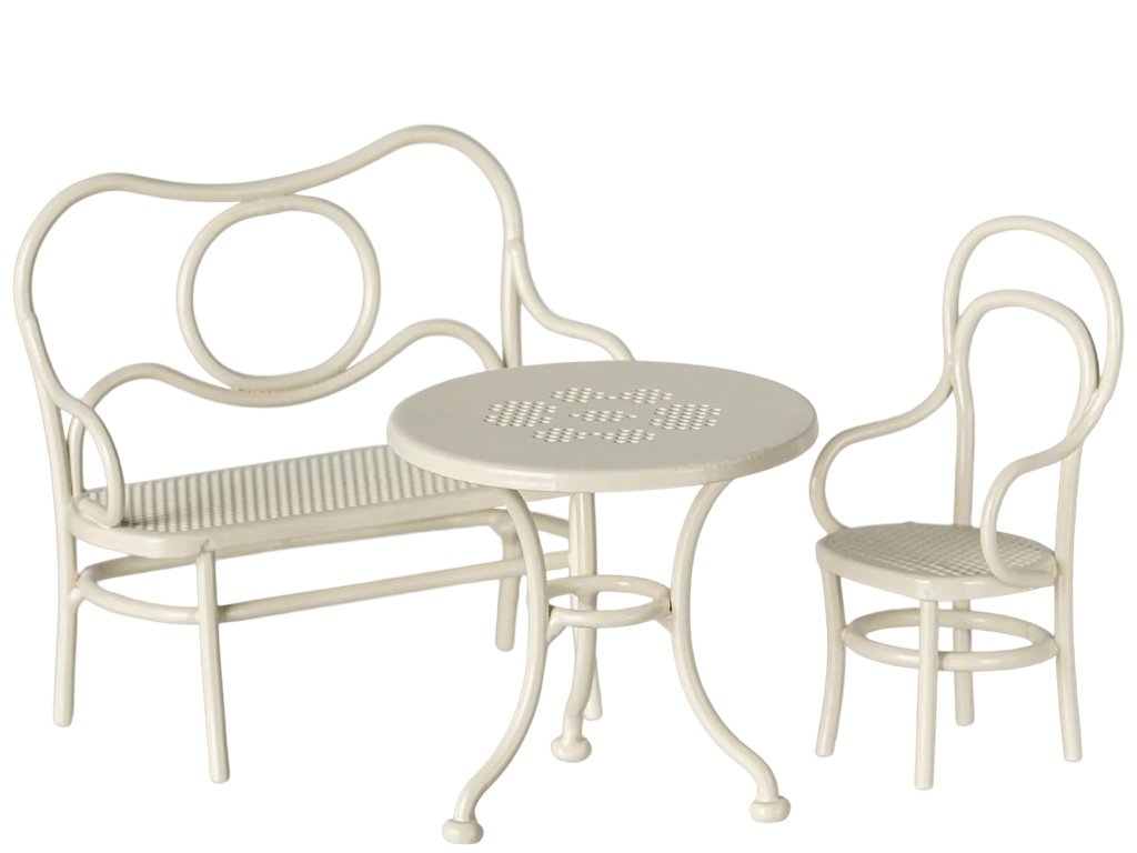 Kovový stoleček s lavicí a židličkou Maileg - Off White
