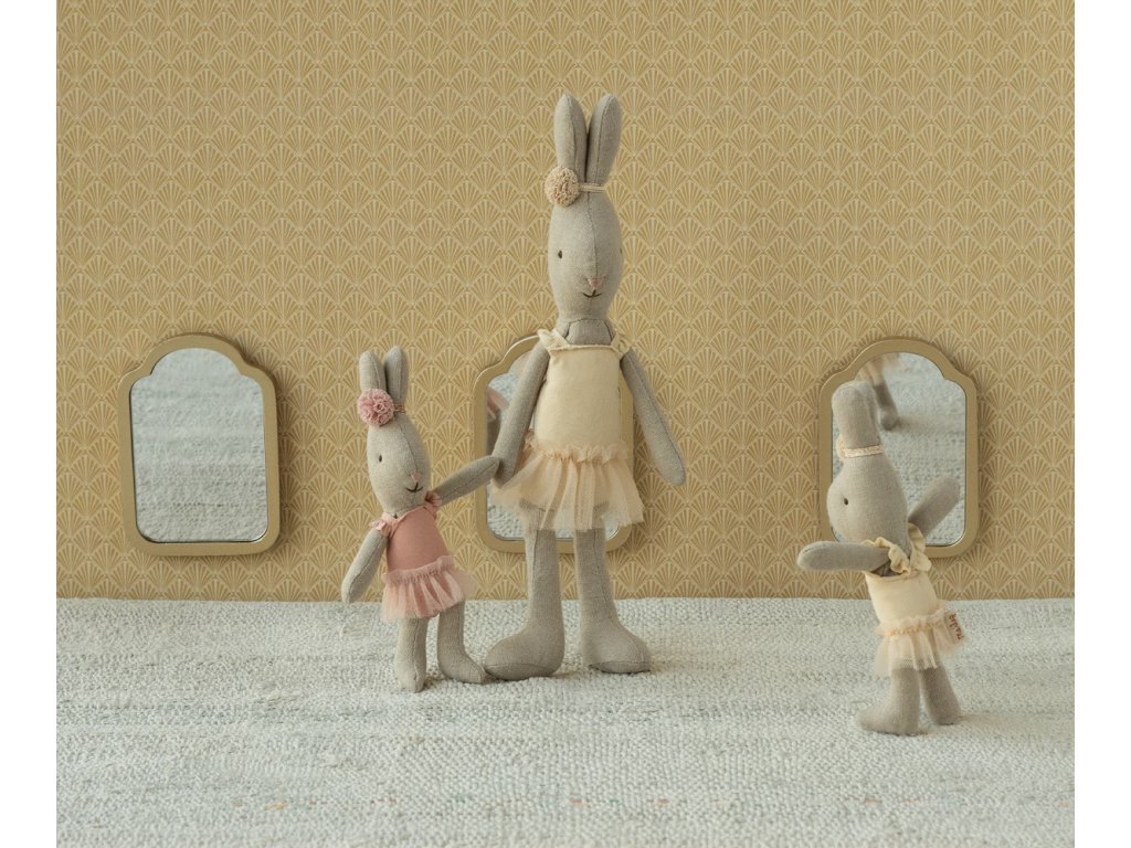 Na scéně se objevuje půvabná králičí baletka Rose od Maileg, připravená roztančit dětskou fantazii. V obláčku tylové sukýnky a s růžovou mašličkou přichycenou na ouškách působí, jako by právě vystoupila z kouzelného baletního sálu, kde se odráží tóny klavíru a pod světly reflektorů září každý její půvabný pohyb.