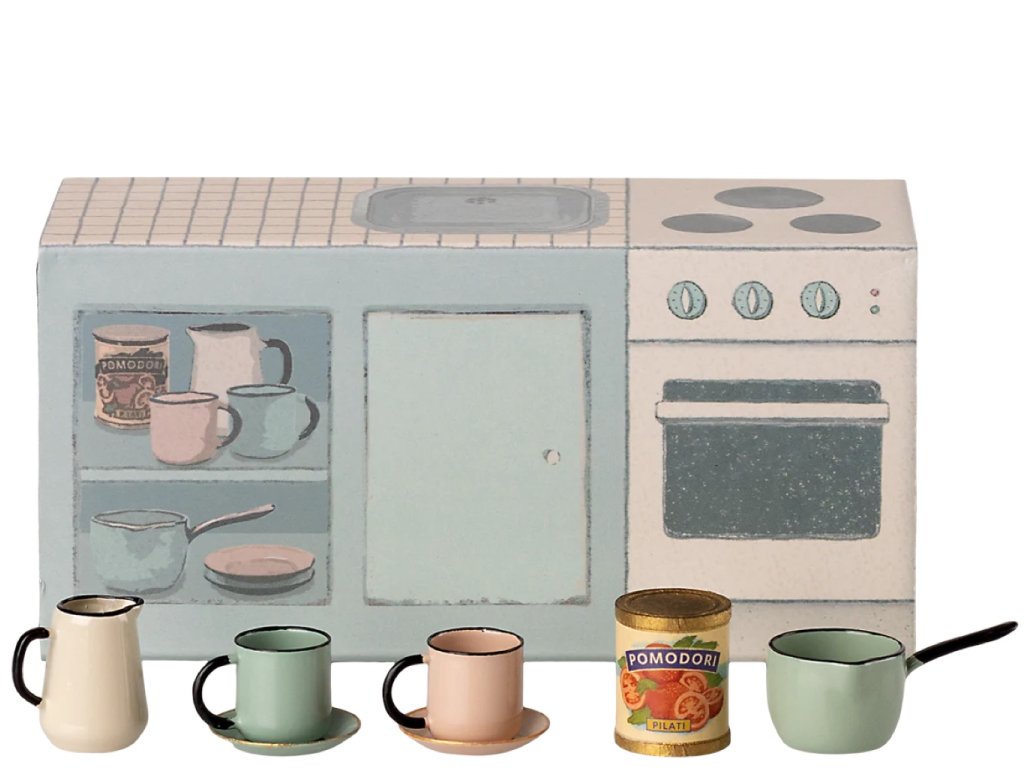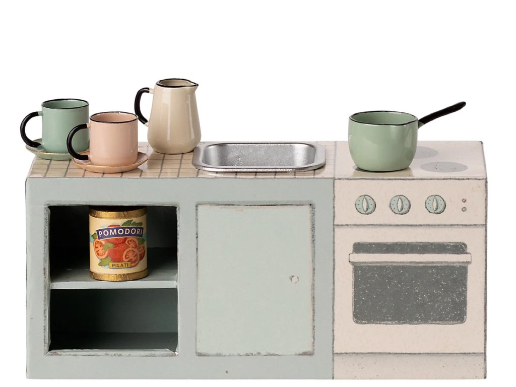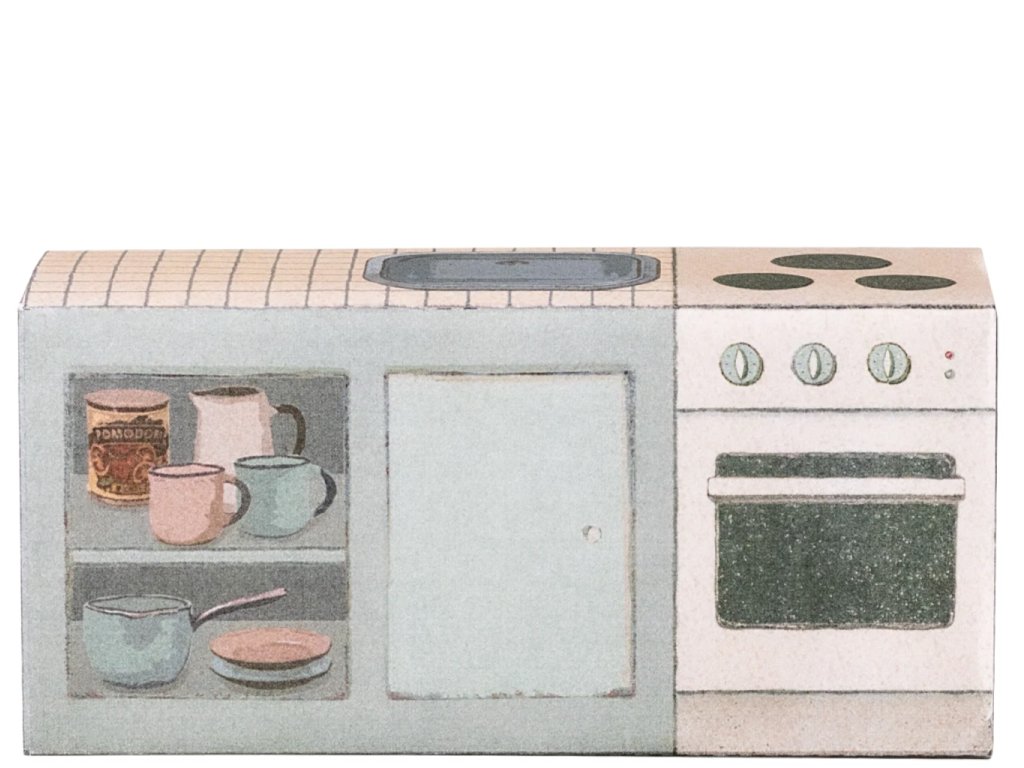 Malá kuchyňská linka pro myšky Maileg je srdcem každého myšího domečku. Je vyrobená z pevného kartonu. Díky detailním ilustracím a chytrým drobnostem působí jako skutečný malinký nábytek. Vše je provedeno s takovým citem, že se s radostí na chvíli zastavíte a navštívíte roztomilý svět Maileg.