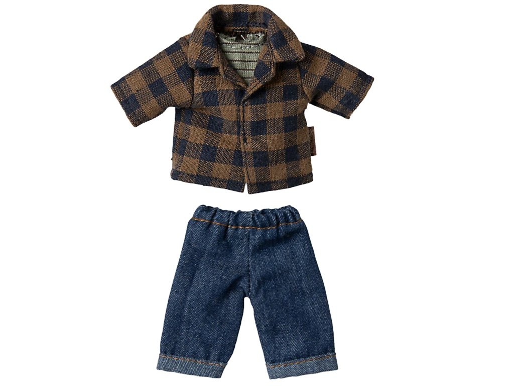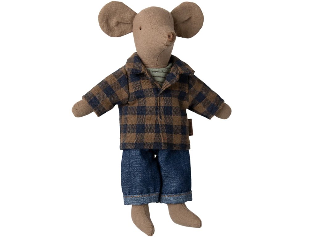 Tento elegantní myšák tatínek je hlavou myší rodiny a vždy má po ruce moudrou radu i otevřenou náruč. Nosí stylový kostkovaný kabátek v modro-hnědých barvách a pod ním pruhované tričko, které podtrhuje jeho ležérní, ale upravený vzhled. Kabátek doplňují tmavé džínové kalhoty, které myšákovi dodávají nádech klasické elegance.