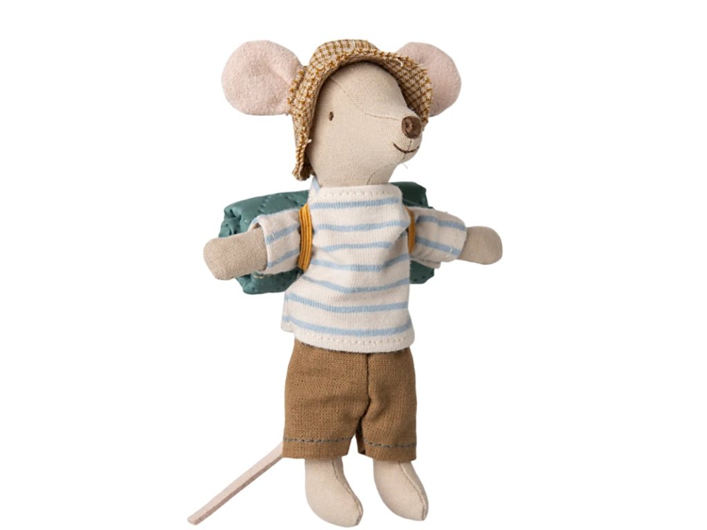 Tento dobrodružný myšák je vždy připraven vyrazit na výpravu! Oblékl si pohodlné kraťasy, pruhované tričko a na hlavu si nasadil praktický plátěný klobouk, který ho ochrání před sluncem během dlouhých cest. Na zádech si nese srolovaný spacák, aby mohl kdykoliv složit hlavu a odpočinout si po náročném dni plném objevování.