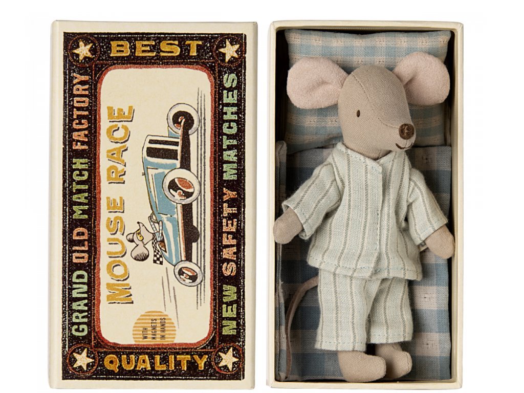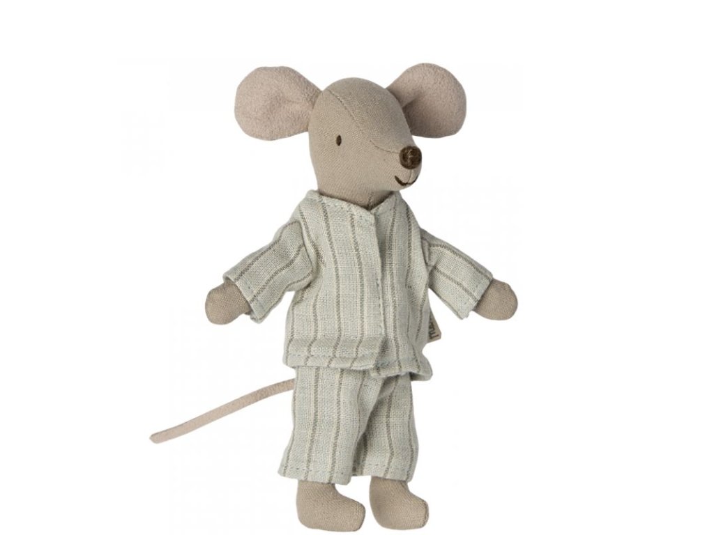 Myšák velikosti Big Brother obléká pruhované pyžamo světle modré barvy. Součástí je kartonová krabička od sirek, ve které má pohodlnou matraci a kostkovanou peřinku s nadýchaným polštářkem.