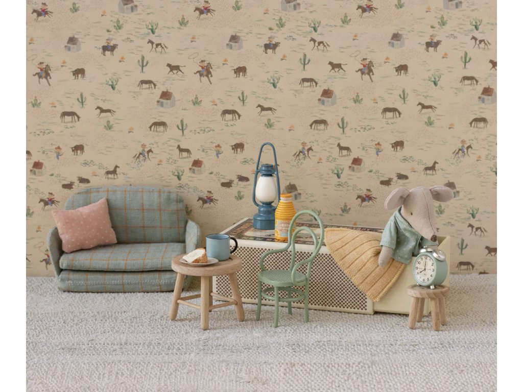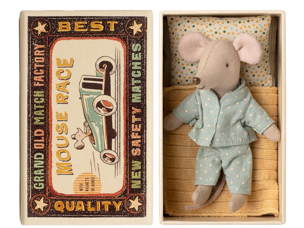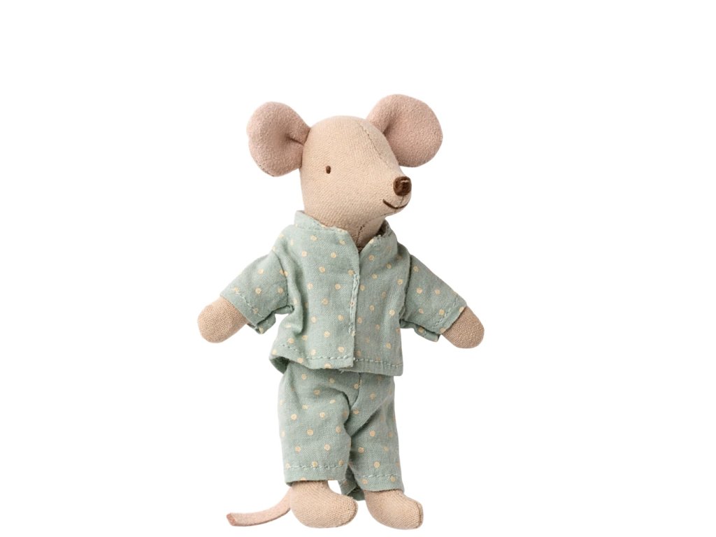 Myšák od značky Maileg je připravený ke spánku a těší se na další dobrodružství, která ho čekají ve světě dětské fantazie. Oblečený je do měkkého pyžama v mentolové barvě s drobnými bílými puntíky, které je jako stvořené pro dlouhé večery plné pohádek. Pyžámko má košilový střih s krátkými rukávy a pohodlné kalhoty, takže se myšák může bez starostí zachumlat, protáhnout nebo vyrazit na noční výpravu za sýrovým pokladem.