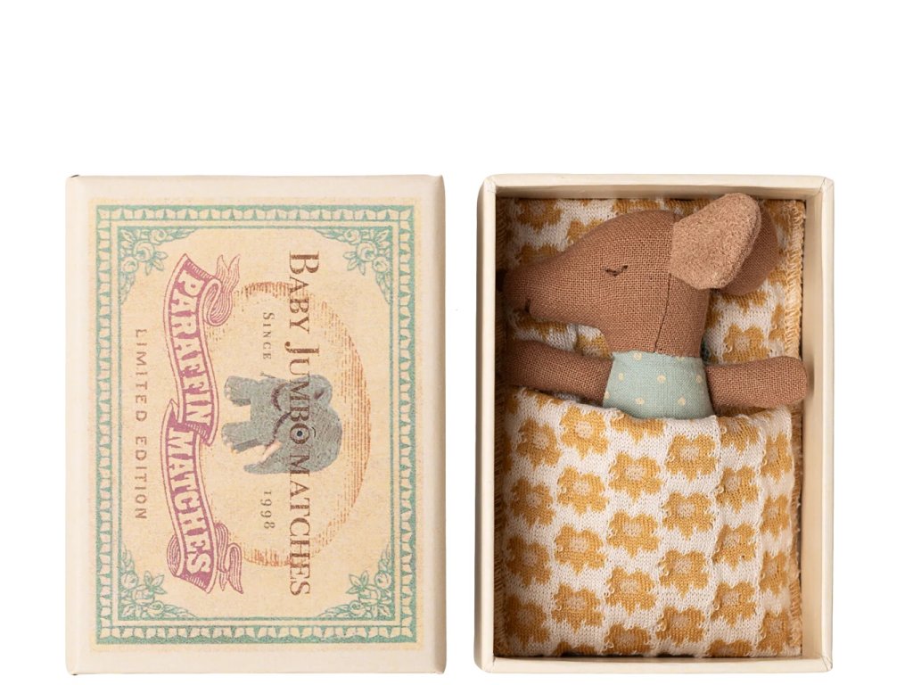 Zavřete oči a zaposlouchejte se do tichého pochrupávání. Malé myší miminko už spí ve své krabičce, zachumlané do měkké dečky se vzorem kvítků. Na sobě má roztomilé světle modré pyžamko s puntíky, které mu dokonale padne. Jeho spokojený úsměv a zavřené oči dávají tušit, že se mu zdá o nejkrásnějších dobrodružstvích ve světě Maileg.