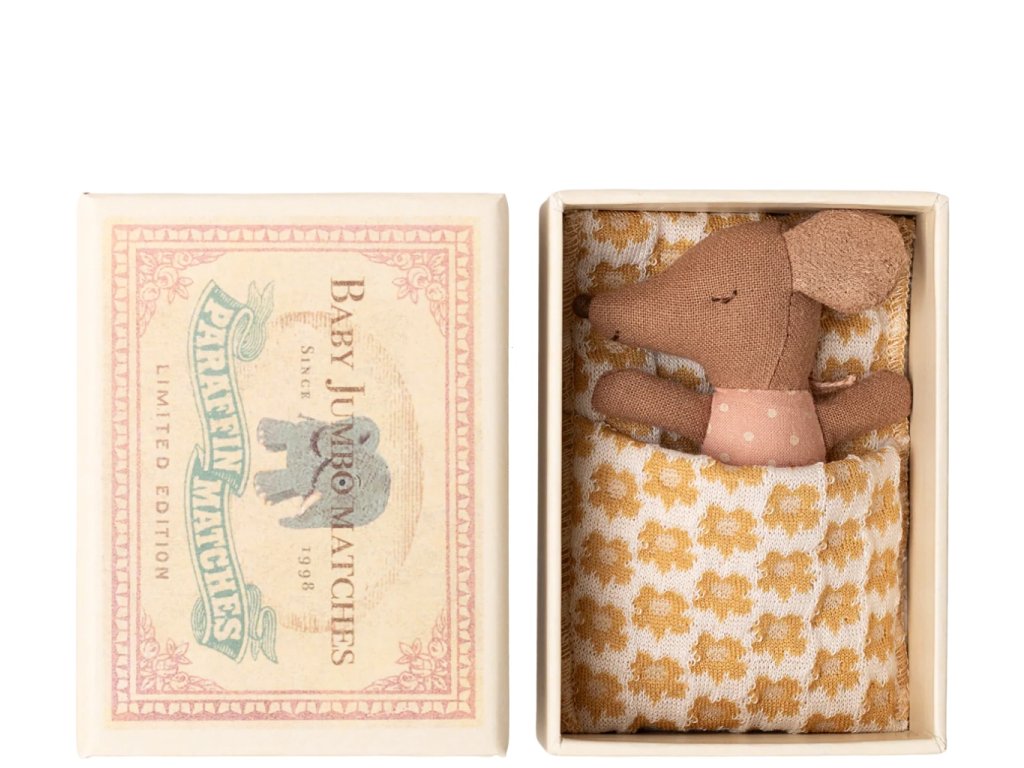 Zavřete oči a zaposlouchejte se do tichého pochrupávání. Malé myší miminko už spí ve své krabičce, zachumlané do měkké dečky se vzorem kvítků. Na sobě má roztomilé světle růžové pyžamko s puntíky, které mu dokonale padne. Jeho spokojený úsměv a zavřené oči dávají tušit, že se mu zdá o nejkrásnějších dobrodružstvích ve světě Maileg.