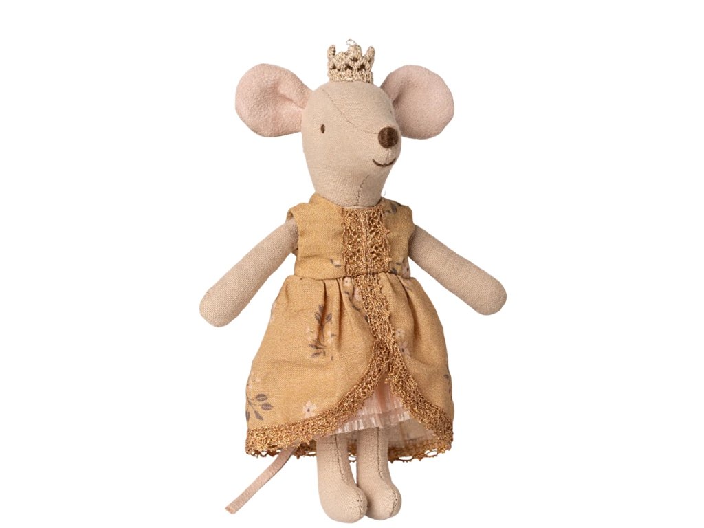 Na hlavě nosí zlatou korunku, která ve světle krásně třpytí a podtrhuje její královské postavení. Její šaty jsou vyrobené ze zlatavé látky s květinovým vzorem, zdobené třpytivou zlatou paspulí, jež se při každém pohybu lehce zaleskne. Spodnička z tylu dodává šatům něžný objem a princezně pohádkový půvab. Je to outfit přesně tak okouzlující, jaký si malá myší princezna zaslouží.