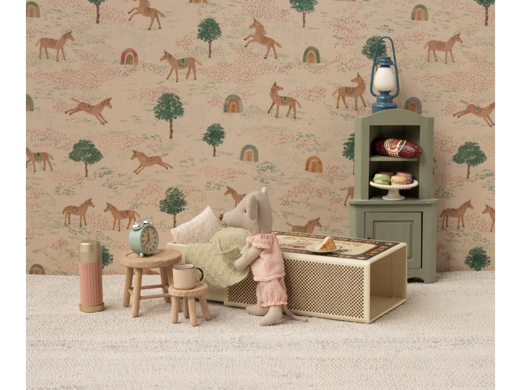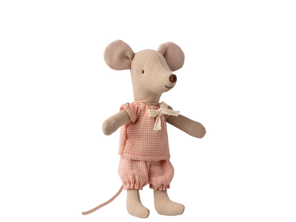 Myška od značky Maileg je malá něžná duše, která miluje klidné večery, šeptané pohádky a bezpečí svého myšího světa. Oblečená je do měkkého kostkovaného pyžama v červenorůžovém tónu, které působí hebce a hravě zároveň. Pyžámko má krátké rukávy, pohodlný střih a drobné detaily v podobě krémové mašličky u výstřihu, díky kterým je myška ještě roztomilejší. Kraťásky s jemným řasením dopřávají myšce pohodlí, ať už se chystá zachumlat ke spánku, nebo potichu vyrazit za malým večerním dobrodružstvím.