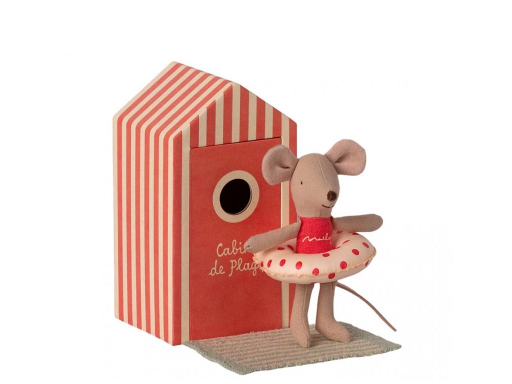 S touto kouzelnou myškou a plážovým domkem jistě vykouzlíte svým ratolestem úsměv na tváři. Myška Little Sister má na sobě červené jednodílné plavky, které si může pohodlně převléknout v pruhované kabince, jejíž součástí je také rohožka. Samozřejmostí je i stylový puntíkatý plovací kruh, protože myška je nejmladším členem rodiny a ještě neumí plavat. Čas dovolené je tady!