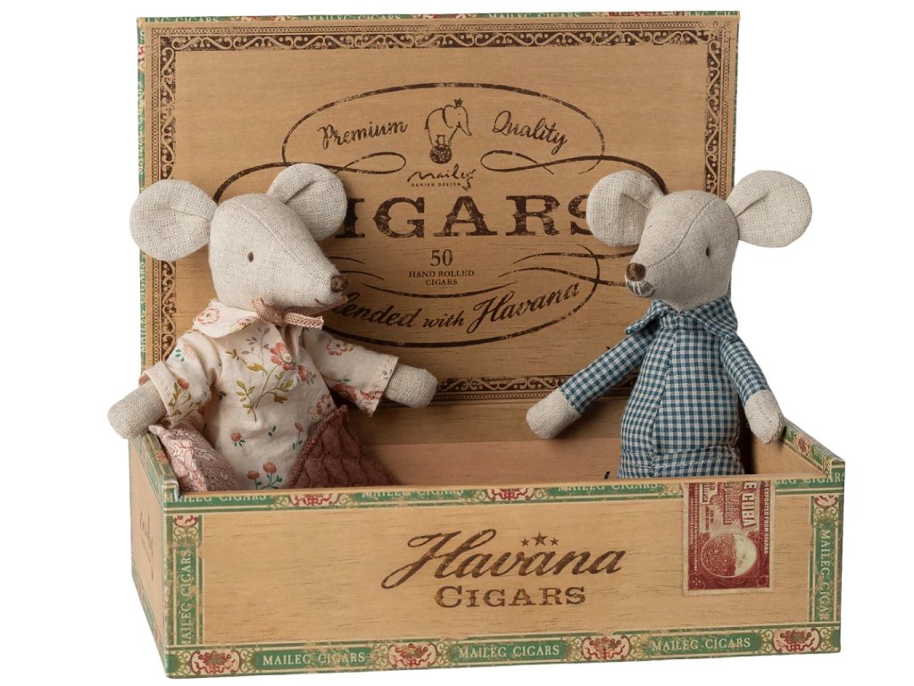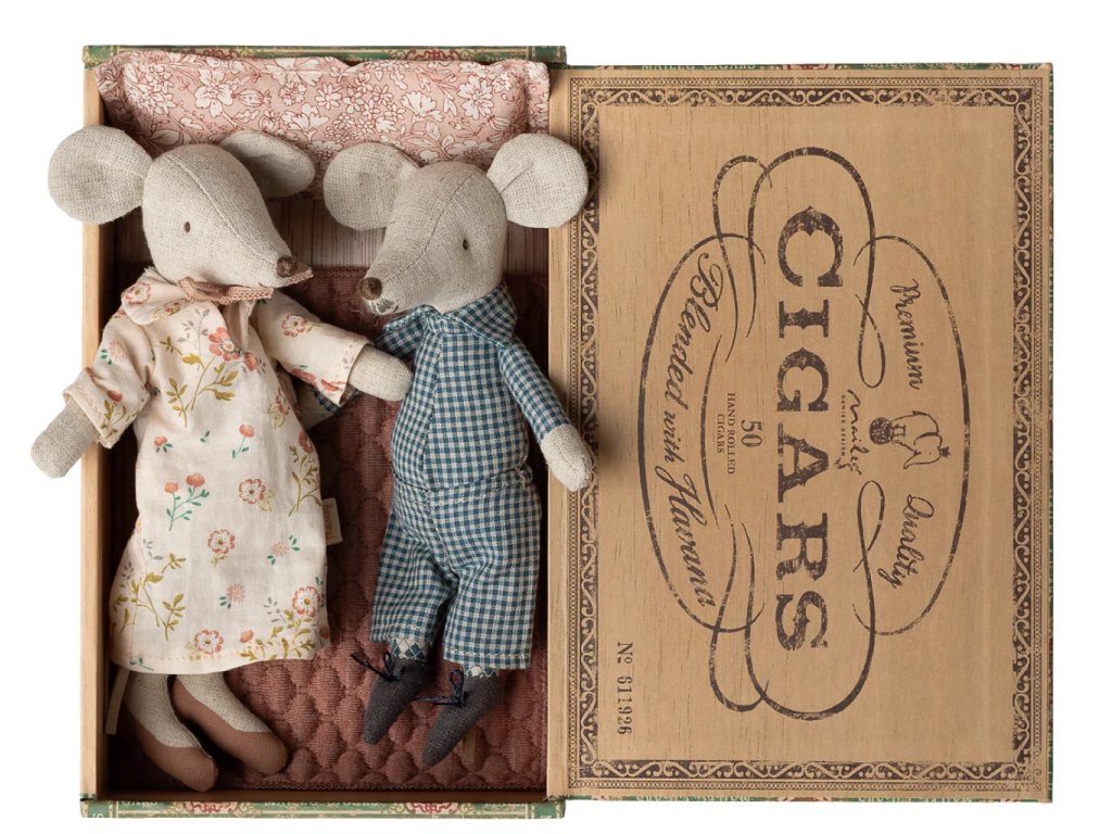 Myšky Babička a Dědeček od dánské značky Maileg přicházejí ve své vlastní krabičce od doutníků, která ukrývá jejich malé, ale útulné zázemí. Obě myšky měří 17 cm a jsou vyrobené z kombinace lnu a bavlny, díky čemuž mají příjemně strukturovaný povrch a pevný tvar. Myška babička má na sobě světlou noční košili s drobným květinovým vzorem, zatímco myšák dědeček obléká kostkované pyžamo v modrém tónu.