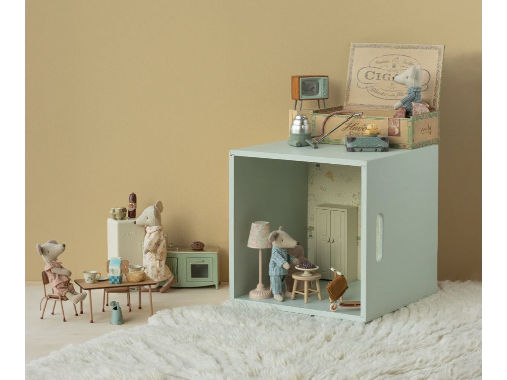 Uvnitř krabičky najdete měkkou matraci, peřinu i polštářek s květinovým motivem, kde si prarodiče po dni plném dobrodružství se svými myšími vnoučátky rádi odpočinou. Představte si večer v dětském pokojíčku, kdy babička vypráví pohádku a dědeček už pomalu usíná zachumlaný pod peřinou. Ráno je čeká společná snídaně na malém stolku nebo procházka po poličce mezi knihami.