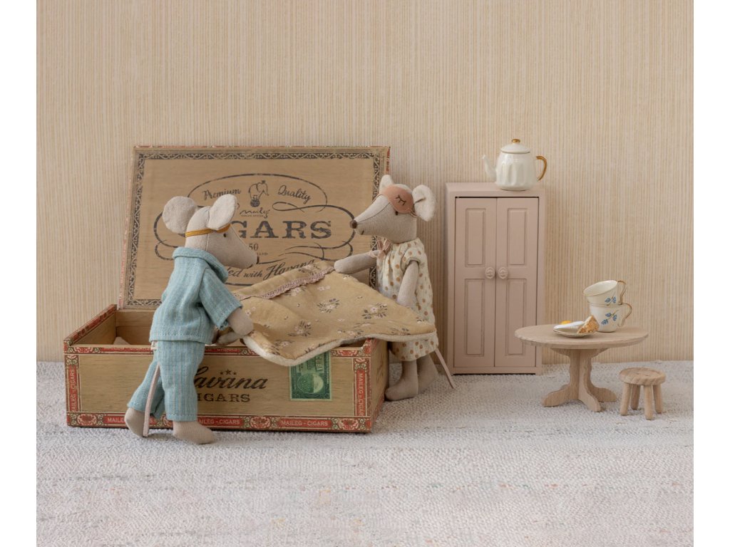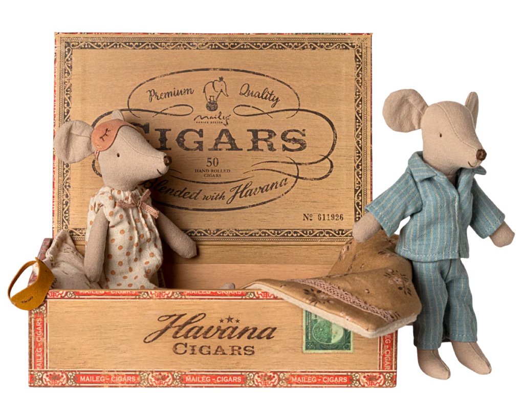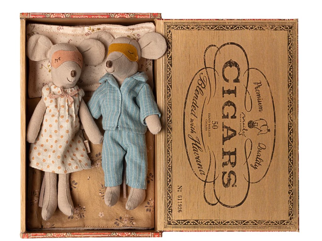 V útulném světě Maileg nastal čas spánku. Myší maminka a tatínek se choulí do svých měkkých peřinek, které voní po čerstvě vypraném prádle a teplu domova. Maminka má na sobě půvabnou noční košilku s puntíkatým vzorem, zatímco tatínek si oblékl své oblíbené pruhované pyžamo. Oba mají na očích měkké masky na spaní, aby je nic nerušilo ve snech, které se rodí pod měkkou dekou.