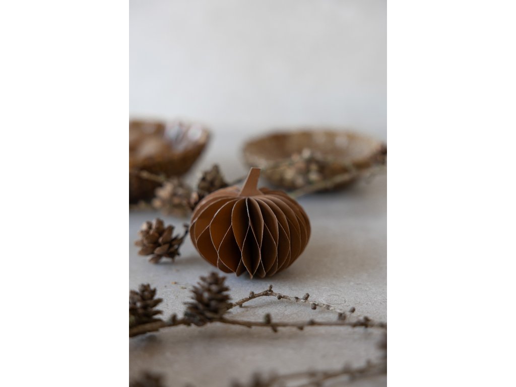 Tmavě hnědá barva připomíná lesní půdu posetou šiškami a listím a dokonale ladí s neutrálními tóny skandinávského interiéru. Dekoraci můžete umístit na stůl, komodu nebo okenní parapet, kde se stane nenápadným, ale výrazným detailem. V kombinaci s větvičkami, svíčkami a dalšími papírovými ozdobami vytvoří jedinečné aranžmá, které promění váš domov v útulné útočiště.