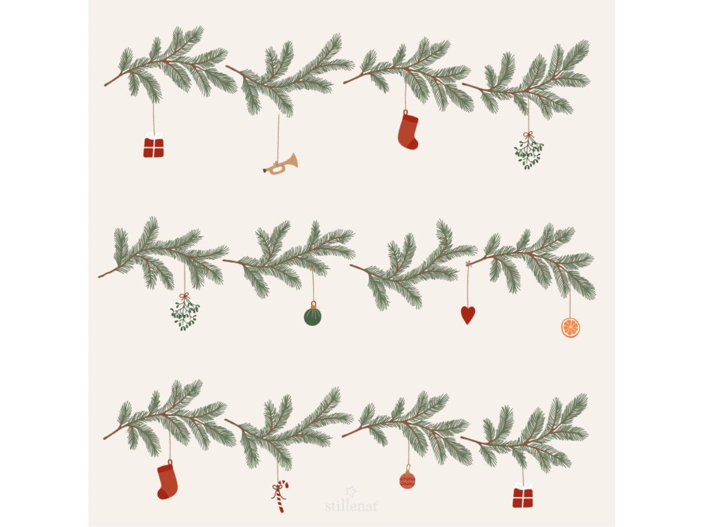 Papírové ubrousky Christmas Garlands vnesou do vašeho domova kouzlo tradičních Vánoc. Na jemném krémovém podkladu se vinou větvičky jehličí ozdobené drobnými dekoracemi, červenými punčoškami, mašličkami, ozdobami i sušenými pomeranči, které působí jako malá vánoční girlanda z přírodnin.