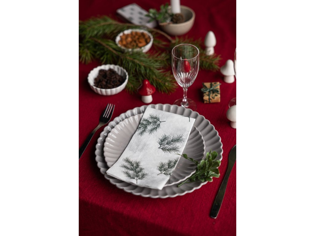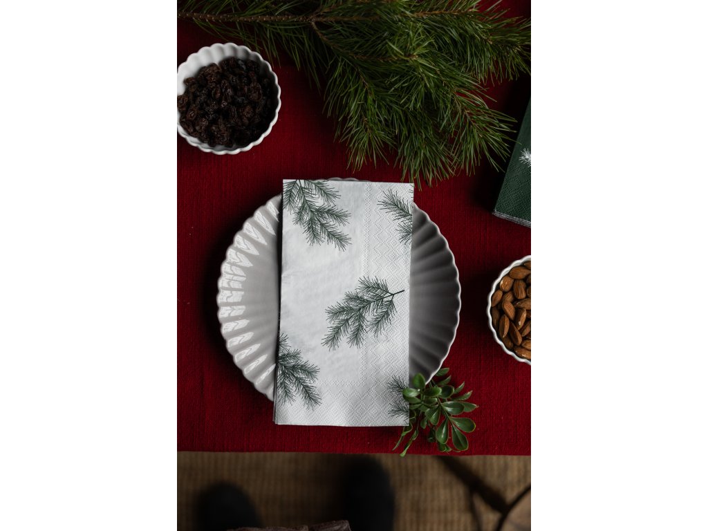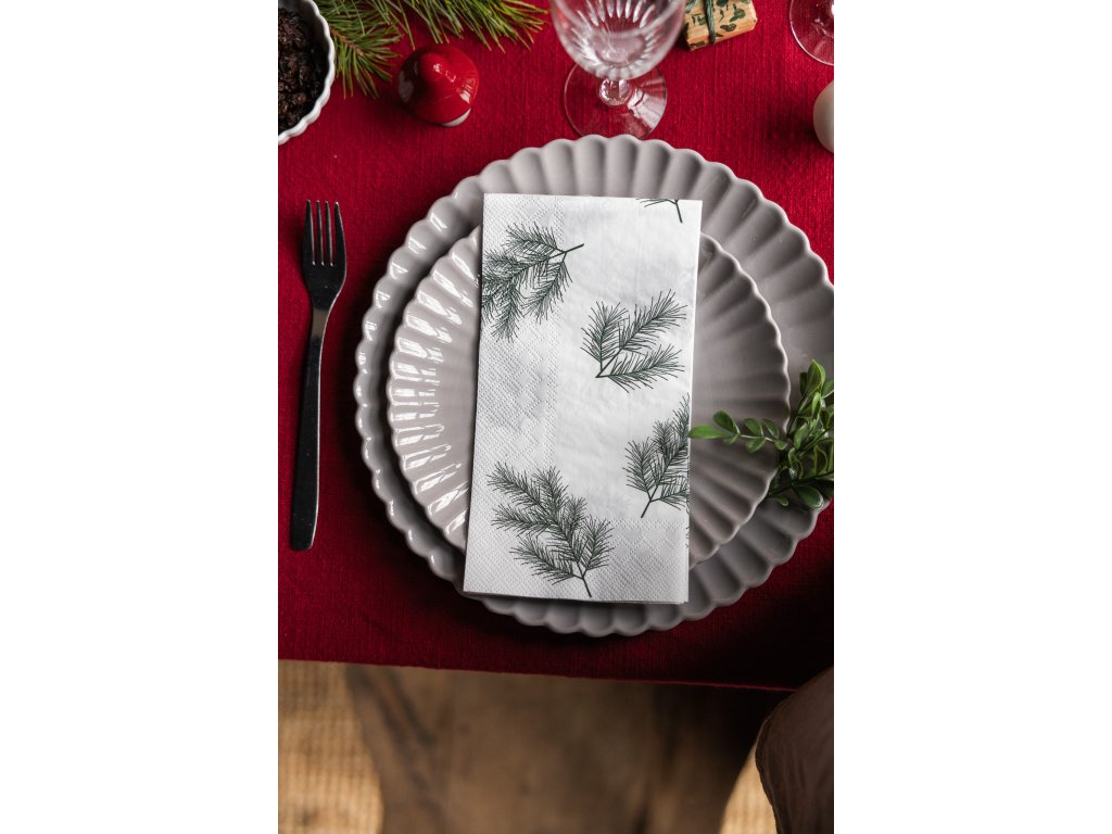 Papírové ubrousky Needles z dílny švédské značky Storefactory Scandinavia jsou ideální volbou právě během vánočních svátků. Na ubrouscích objevíte minimalistický motiv smrkových větviček. Zcela originální ubrousky vám pomohou dozdobit prostřenou tabuli během slavnostních chvil a navíc skvěle ladí k bílému porcelánu.