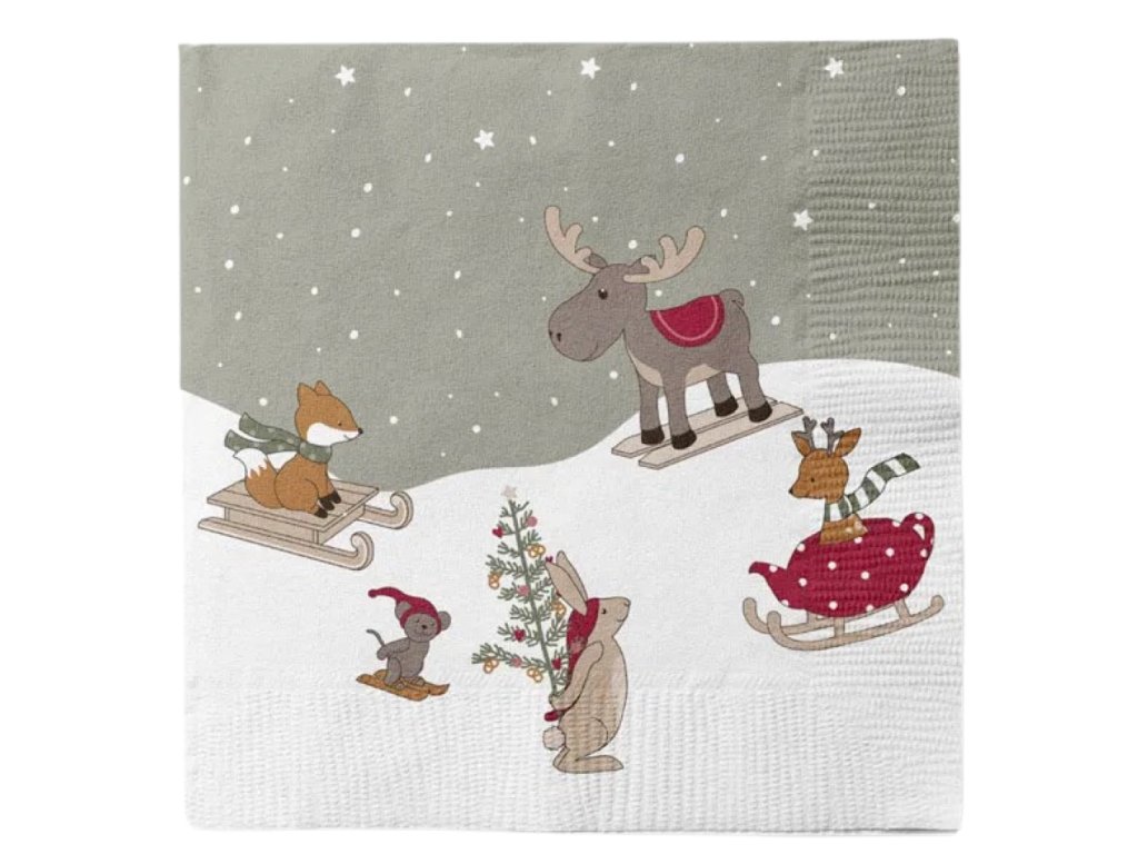 Ubrousky Nordic Pixie od dánské značky Det Gamle Apotek rozzáří každou sváteční tabuli a vnesou do stolování hravou zimní atmosféru. Jejich motiv zachycuje zasněženou krajinu plnou zvířátek a kouzelných postaviček, které připomínají pohádkové dobrodružství v severské přírodě.