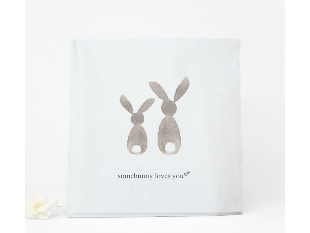 Papírové ubrousky s motivem dvou zajíčků jsou jednoduchým doplňkem, který přirozeně zapadne do velikonočního i jarního stolování. Ilustrace v tlumených tónech působí jemně a roztomile, s drobným nápisem „Somebunny Loves You“, který motiv citlivě doplňuje.