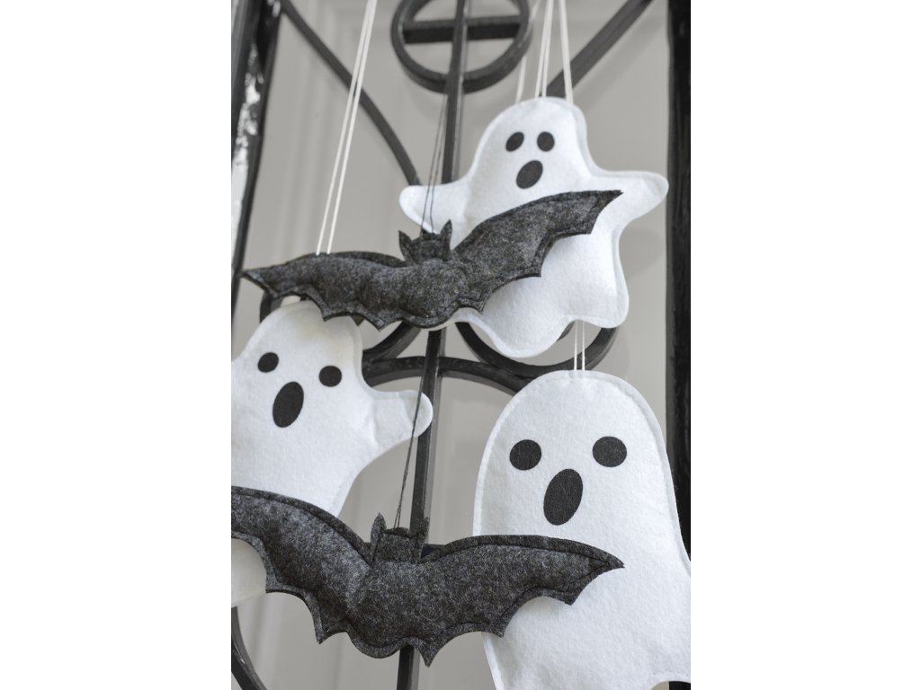 Díky lehkému provedení ho snadno zavěsíte na dveře, okno, větvičky ve váza nebo ho začleníte do větší kompozice spolu s dýněmi a netopýry. Sněhově bílá barva krásně vynikne v kontrastu s podzimními tóny, takže se stane okamžitě viditelným detailem, který přitáhne pozornost.