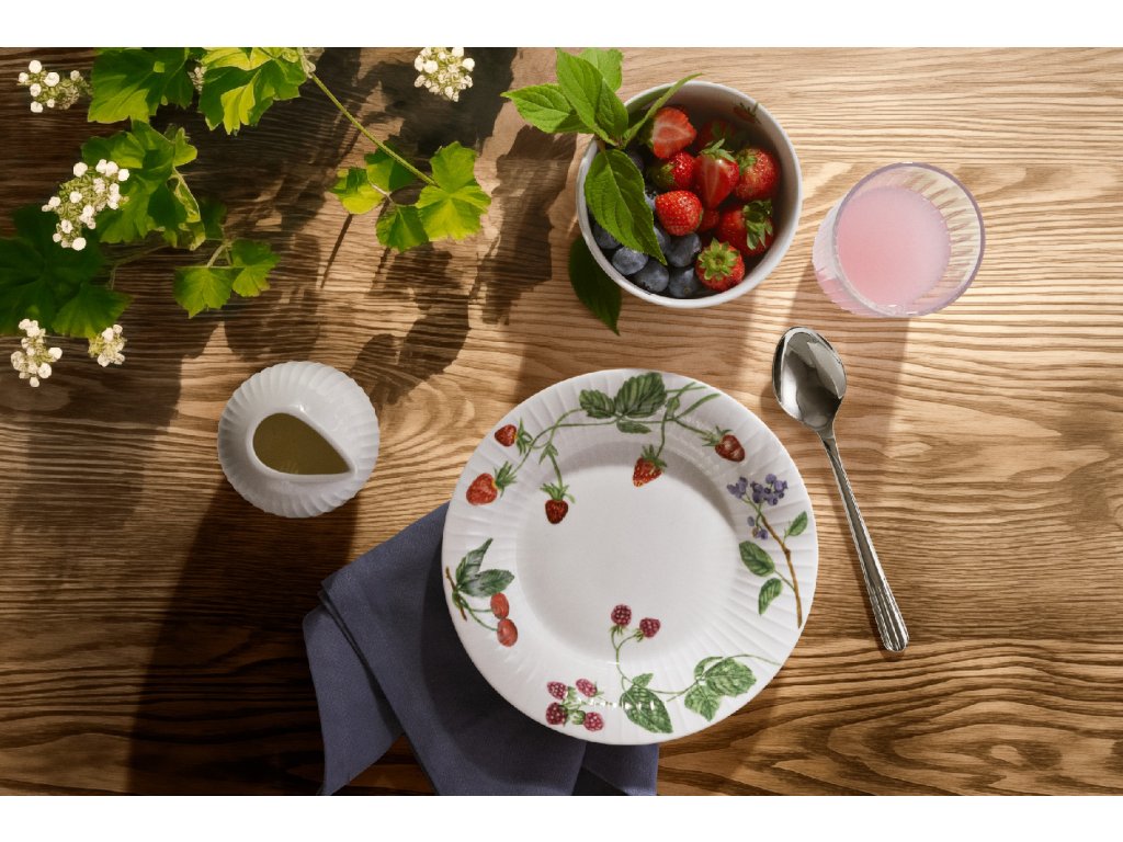 Nechte svou letní tabuli rozkvést s polévkovým talířem Hammershøi Summer Berries, který přináší hravou kombinaci sladkých letních plodů a jemného skandinávského designu. Tento elegantní talíř o průměru 21 cm je zdoben detailními akvarelovými ilustracemi jahod, borůvek, malin a třešní. Nový motiv, inspirovaný bohatstvím dánské letní přírody, dokonale zapadá do ikonické kolekce Hammershøi Summer. Stejně jako u ostatních kusů této řady se zde rostliny a plody přirozeně rozprostírají po jemných drážkách porcelánu, což vytváří dojem, že bobule a listy spontánně ožívají a tančí na povrchu.